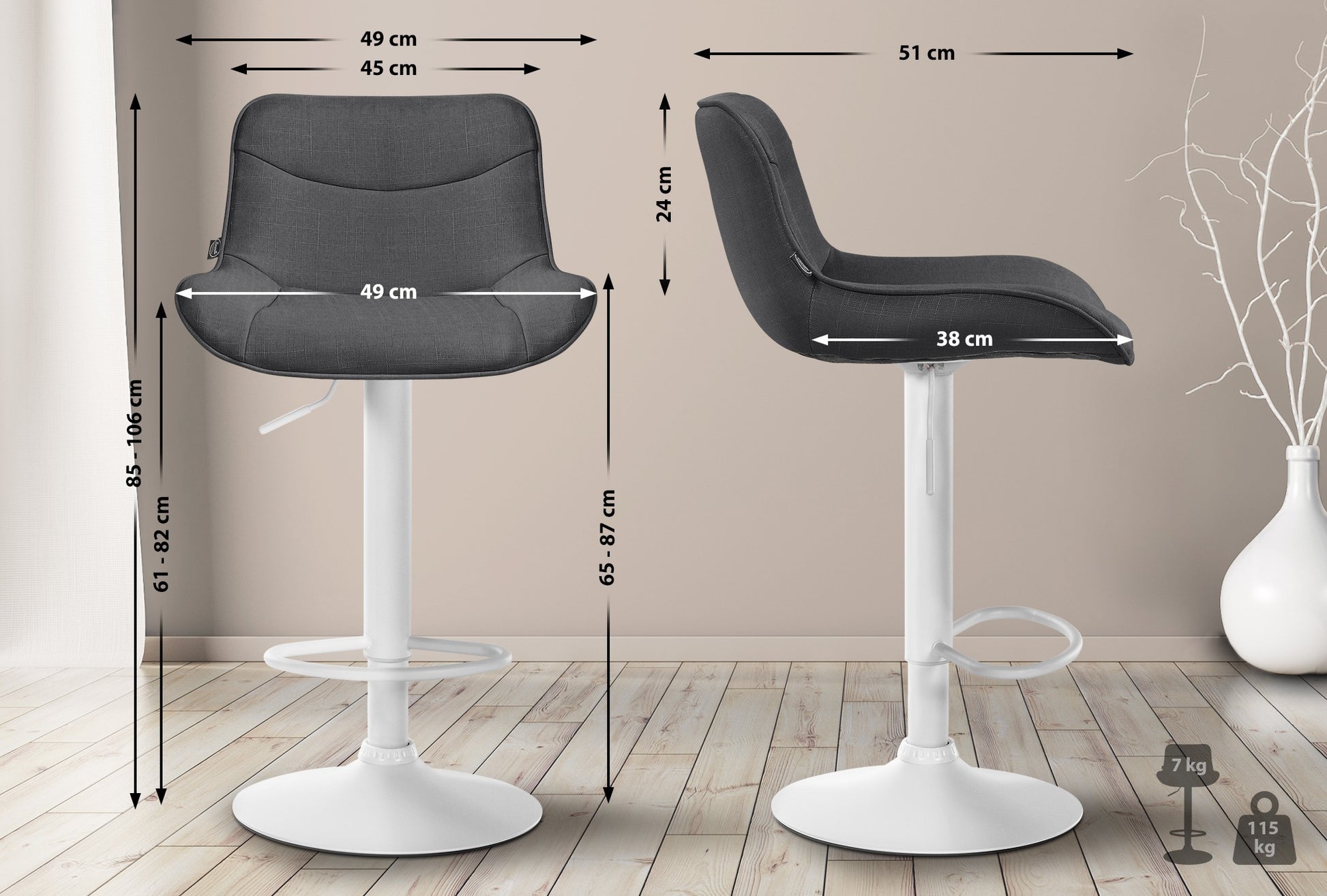 Deze stoffen barkrukken combineren functionaliteit met een stijlvol, modern design. De krukken zijn in hoogte verstelbaar en uitgerust met een comfortabele gestoffeerde zitting die ergonomisch is vormgegeven voor maximaal comfort. Dankzij de 360° draaifunctie en traploze hoogteverstelling kun je flexibel zitten.