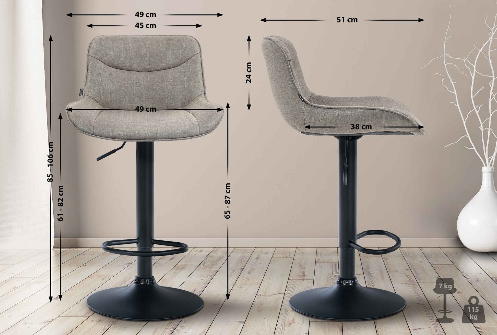 Deze set van stoffen barkrukken is een prachtige combinatie van functionaliteit en eigentijds design. De barkruk is in hoogte verstelbaar en heeft een comfortabele, gestoffeerde zitting met een ergonomische vorm. De kruk kan 360° draaien en de hoogte is traploos verstelbaar, wat verschillende zitopties mogelijk maakt.