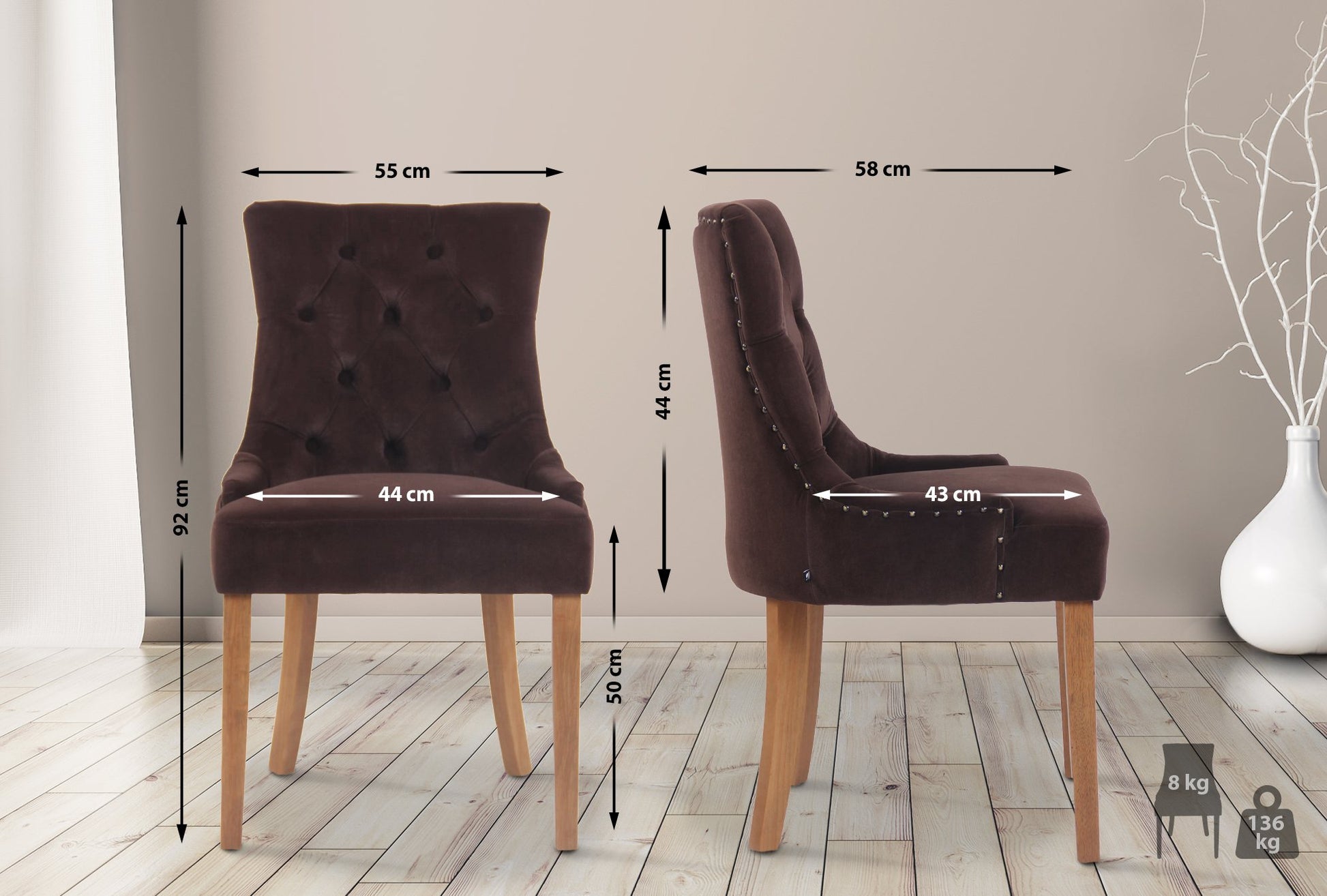 Uw interieur wordt elegant verbeterd met de fluwelen eetkamerstoelen set van 4. Deze stoelen zijn smaakvol gestoffeerd met fluweel en afgewerkt met prachtige sierstiksels en knopen, wat een unieke flair toevoegt aan uw eetkamer, keuken of andere woonruimte. Elke stoel staat op een stevig onderstel van rubberhout voor een warme en uitnodigende uitstraling.