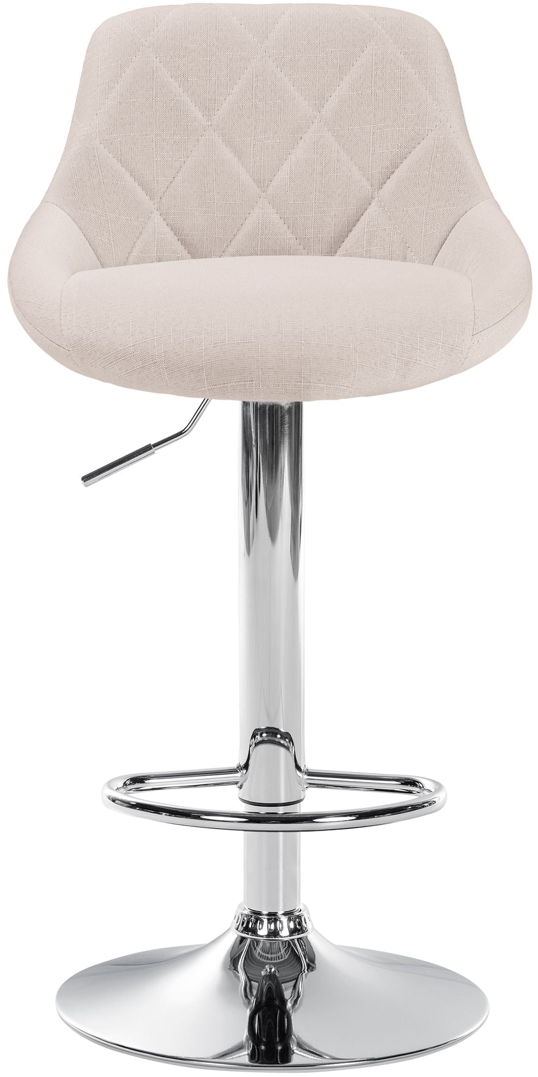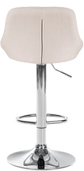 Deze barkruk valt op door zijn elegante design. De zitting is bekleed met stof en voorzien van verfijnde decoratieve stiksels. Dankzij de gasveer is het model traploos in hoogte verstelbaar en dus geschikt voor elke barhoogte. De voetsteun, die bijdraagt aan uitstekend zitcomfort, kan synchroon in hoogte worden aangepast. De zitting is 360° draaibaar met de voetsteun. Het frame is gemaakt van metaal met een chroomlook, en onder de trompetvoet zijn vloerbeschermers geplaatst om krassen te voorkomen.