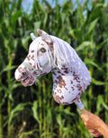Super Hobby Horse A3 – een prachtig, realistisch paardenstokpaard in de kleur bruine luipaard met witte manen. Dit handgemaakte stokpaard is perfect voor urenlang speelplezier, zowel binnen als buiten.