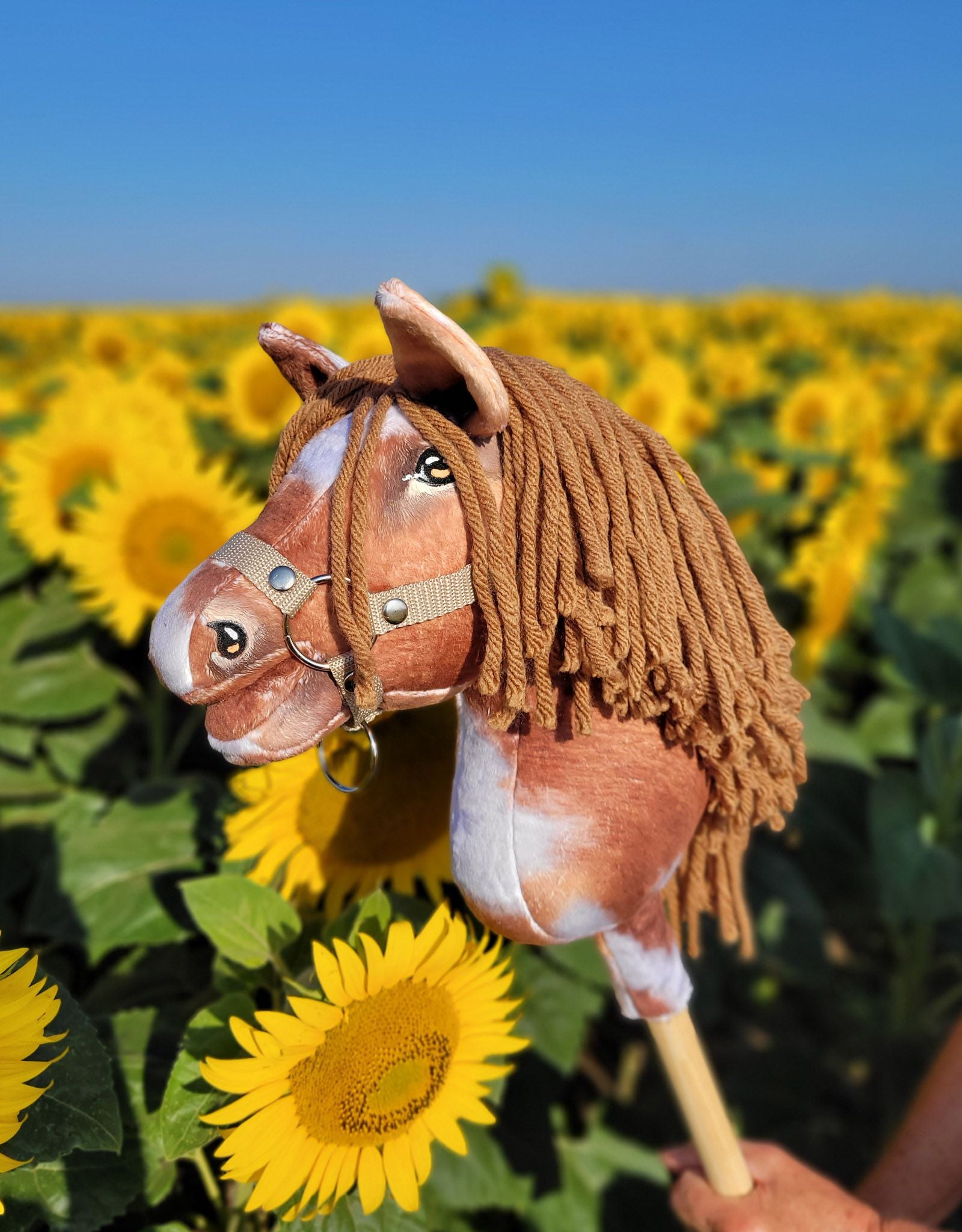 Ontdek het plezier en de actie met deze prachtige, realistische Super Hobby Horse op stok, formaat A4. Dit handgemaakte tobiano bay paard met zachte bruine manen en een rijk gedetailleerde uitstraling zorgt voor eindeloos speelplezier thuis of buiten.