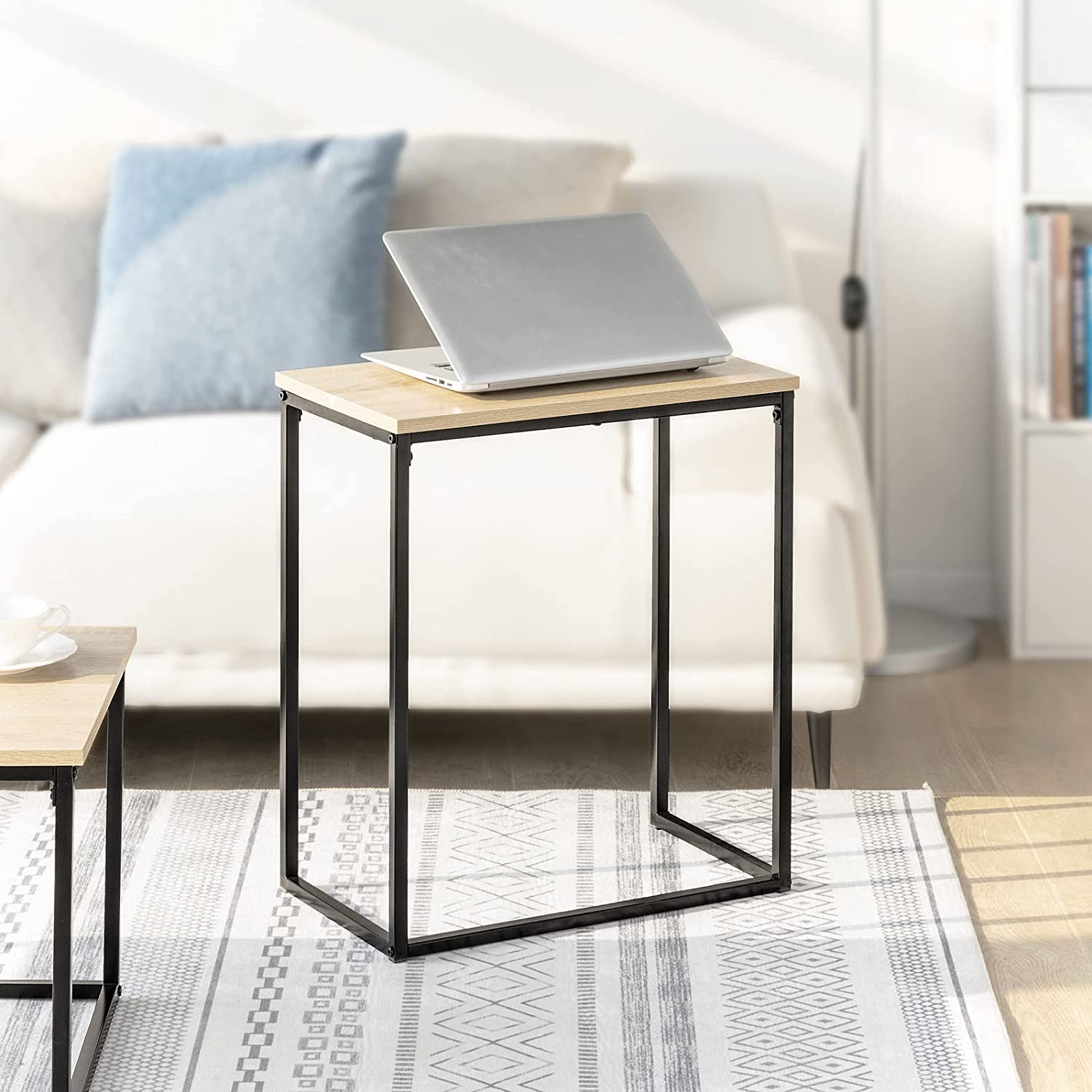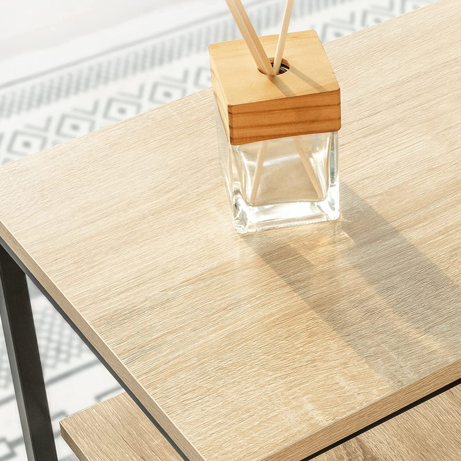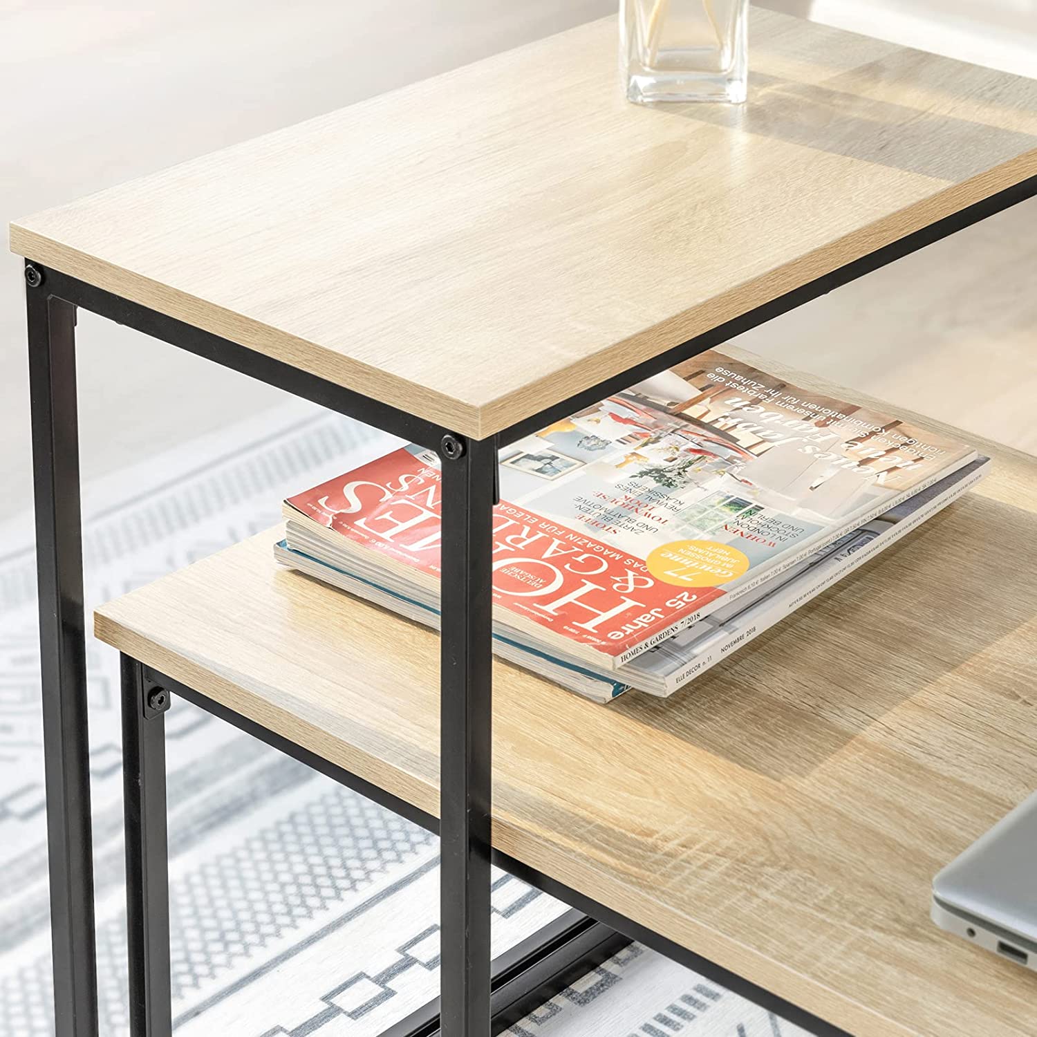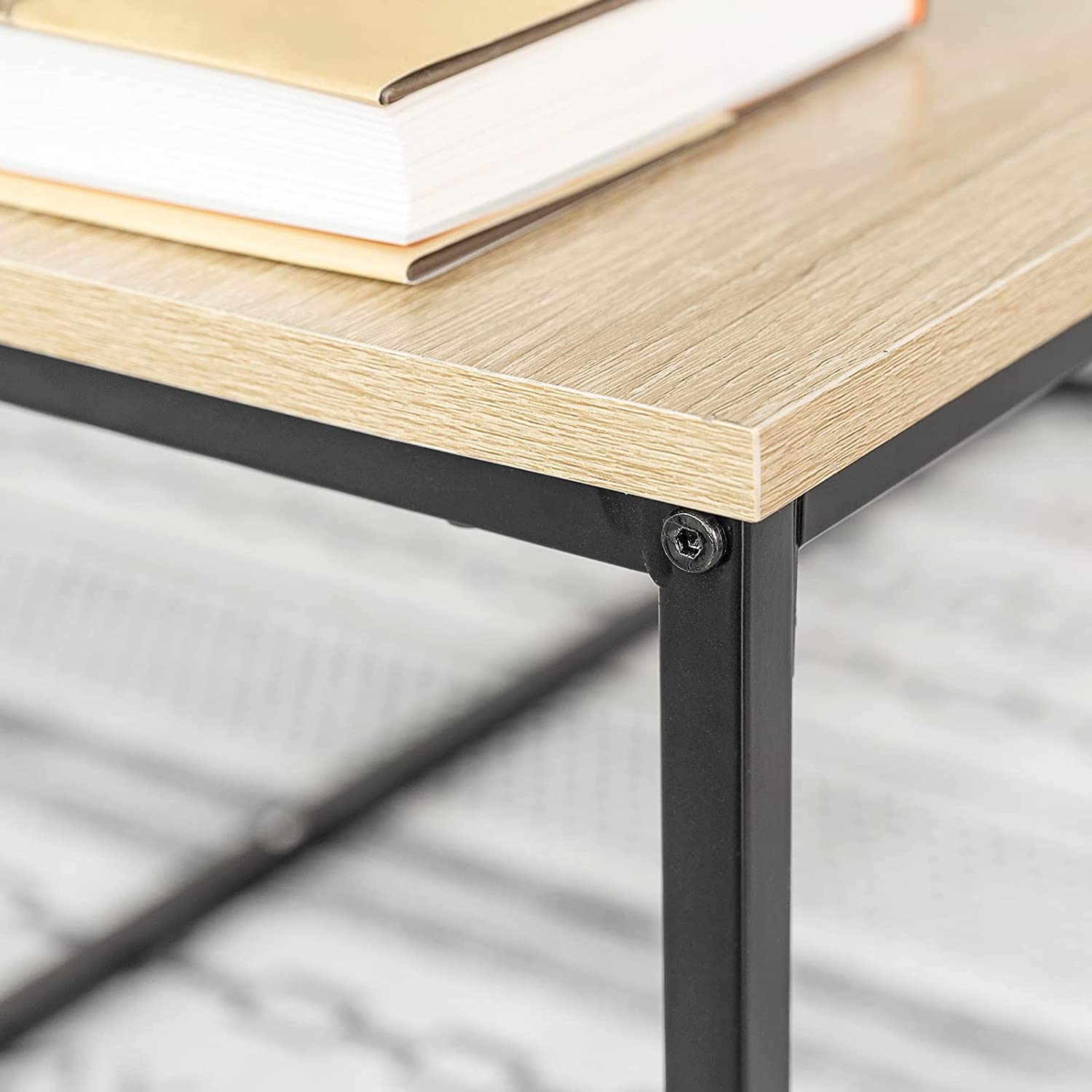- Spaanplaatblad met houteffect. Zwart gepoedercoat stalen frame. Stevig en duurzaam.