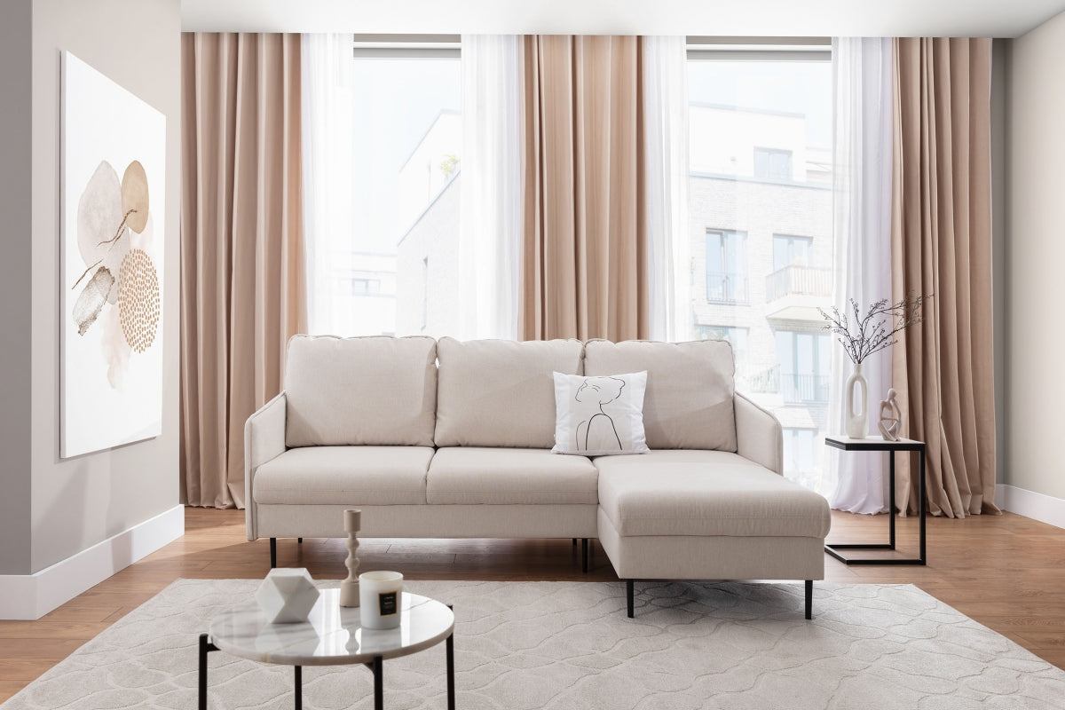 Ontdek de stijlvolle Taila Mini hoekbank rechts met slaapfunctie in een elegante beige vlecht (Loft 01) en moderne zwarte poten. Het Scandinavische design, gecombineerd met hoogwaardige materialen als hout, spaanplaat en metalen poten, zorgt voor duurzaamheid en comfort. De zitting is voorzien van T30-polyurethaanschuim en golfveren, waardoor je geniet van optimaal zitplezier. Dankzij het praktische formaat en het minimalistische uiterlijk past deze hoekbank perfect in elk interieur, van modern tot klassiek.