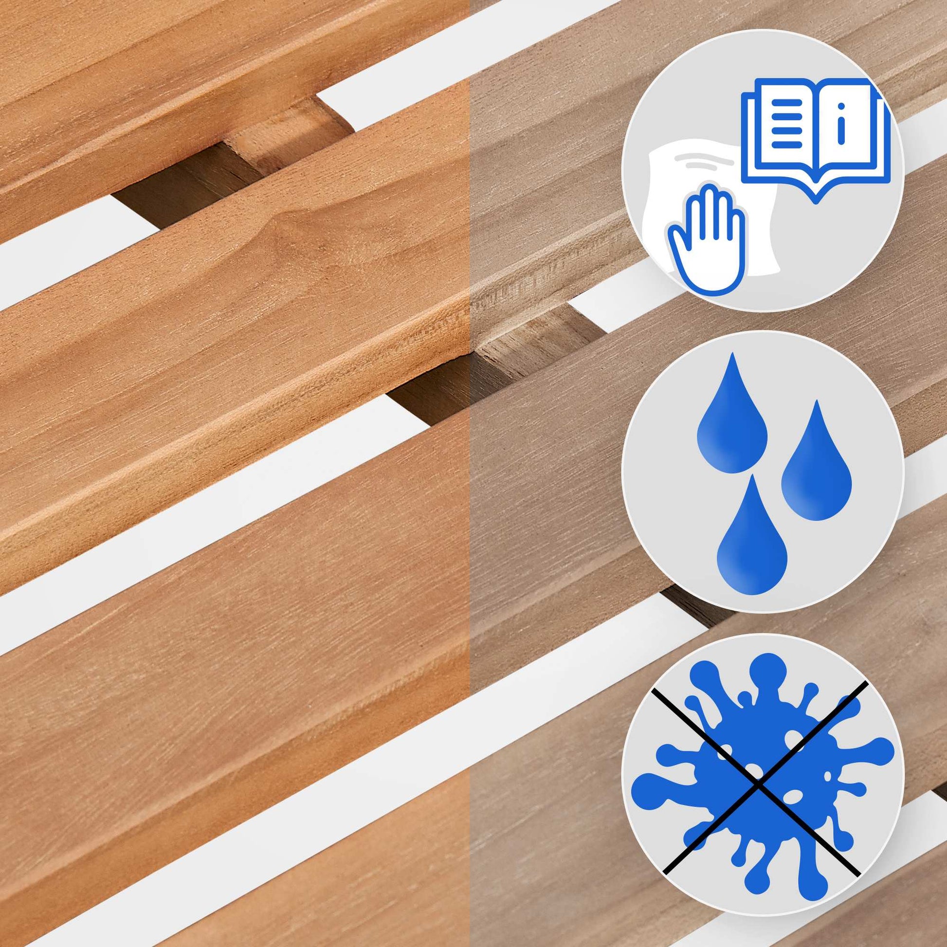 Teak hout is een uitzonderlijk duurzaam materiaal. Je teakhouten tuinmeubelen kunnen daarom het hele jaar door buiten blijven staan. Om de kleur te behouden, zijn er geschikte onderhoudsoliën voor teak hout verkrijgbaar, indien nodig beschikbaar in speciaalzaken.