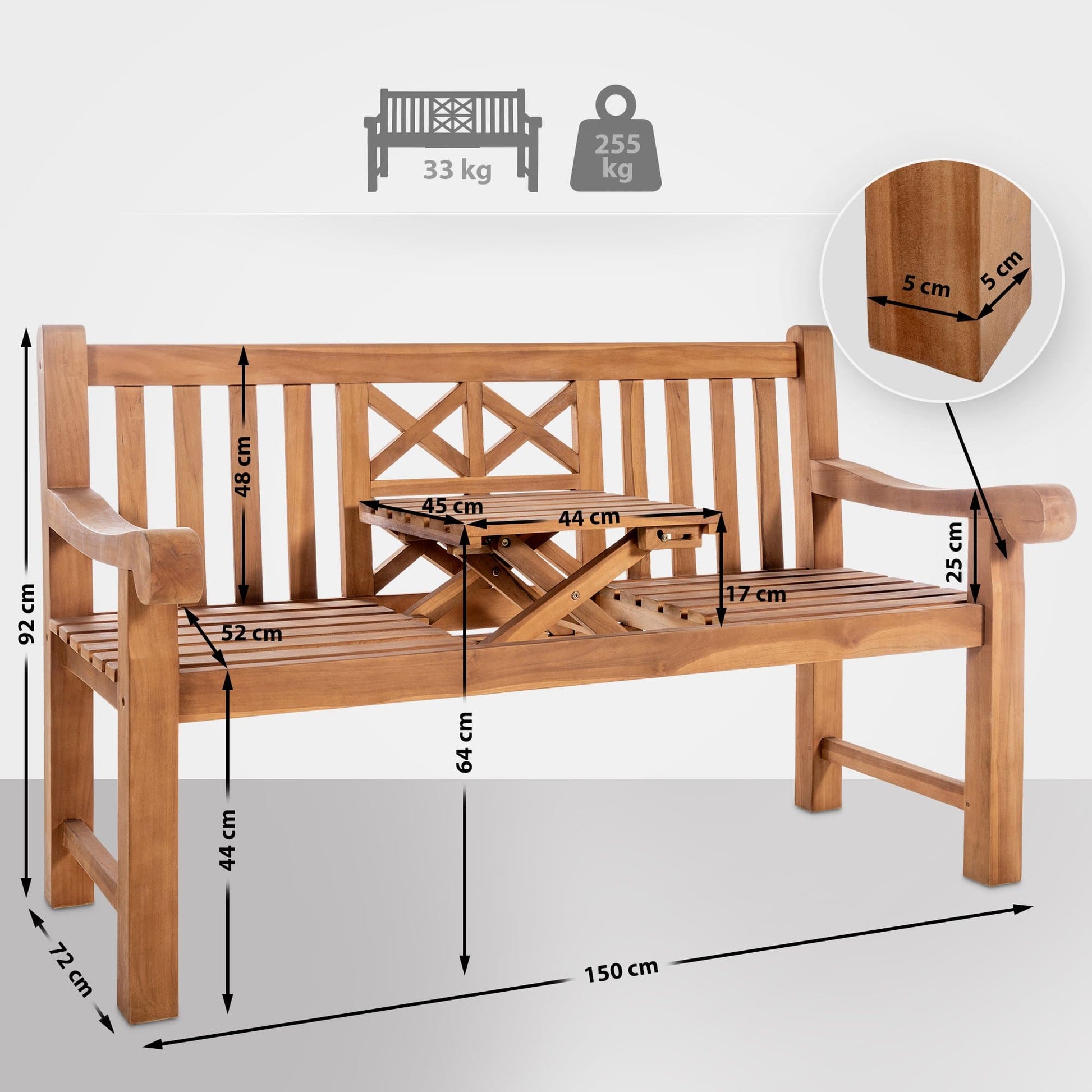 Deze elegante teakhouten bank combineert klassieke stijl met praktische gebruiksgemakken dankzij het ingebouwde klaptafeltje. Het tafeltje klapt eenvoudig uit de zitting omhoog, ideaal voor drankjes of boeken, terwijl er nog twee personen kunnen zitten. Wanneer het tafeltje is ingeklapt, biedt de bank ruimte aan drie personen. Het comfortabele ontwerp, met rugleuning en armleuningen, past perfect in verschillende stijlen van interieur en tuinomgevingen. Het hoogwaardige teakhout is weerbestendig, waardoor de bank het hele jaar buiten kan staan zonder schade. Capaciteit tot 255 kg.