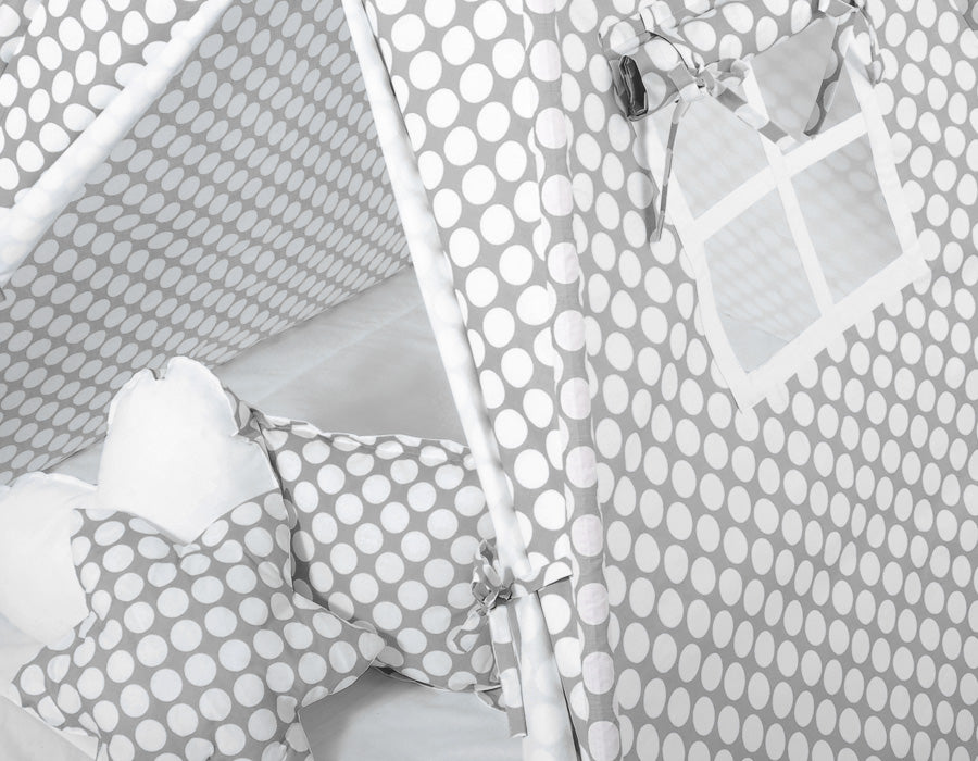 Tipi Tent voor Kinderen + Decoratieve Veren – Grijs met Witte Dots
