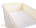 Deze universele XXL bumper is speciaal ontworpen voor de babybedden van 60x120 cm en 70x140 cm. Met een iets afgeronde vorm en extra stiknaden biedt hij optimale bescherming en comfort. De hoge hoofdeinde is subtiel gebogen en versierd met decoratieve hartjes, afgewerkt met een elegante satijnen bies.