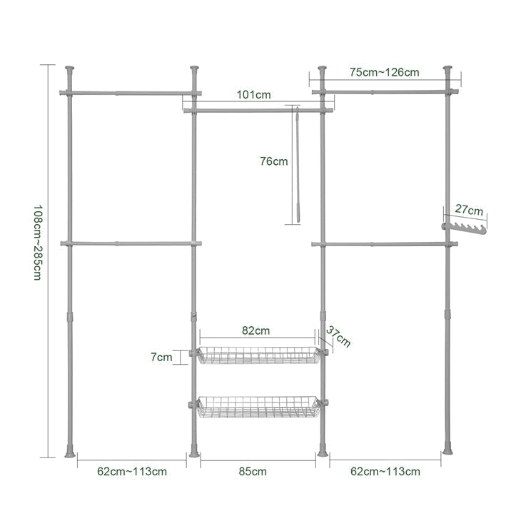 Moeiteloze installatieVergeet ingewikkelde montage-instructies! Dit telescopische kledingroedesysteem is ontworpen voor eenvoudige montage en demontage, zodat u het snel en zonder gereedschap kunt installeren.