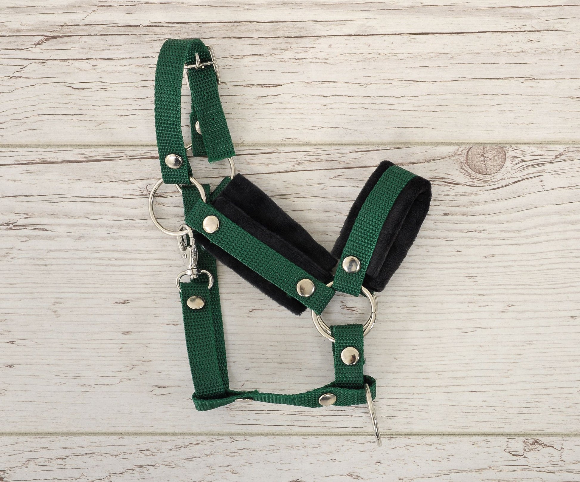 Praktische en duurzame halster met zachte pluche voor het hobby paard. Gemaakt van hoogwaardig nylonband van 1,5 cm breed en zacht minky materiaal. Voorzien van een verstelbare gesp voor de perfecte pasvorm en een eenvoudige sluiting met haakje.