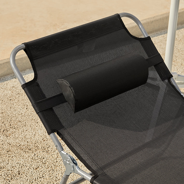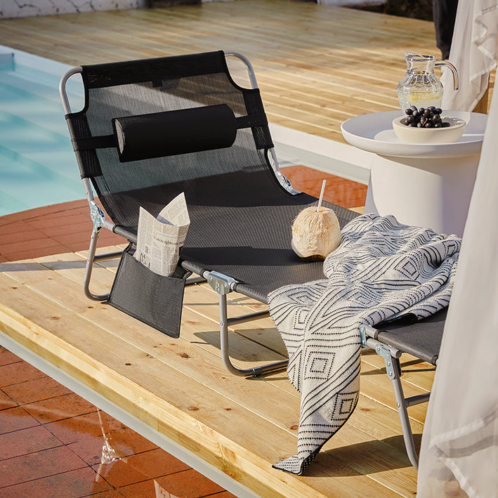 Verstelbare Ligstoel - Strandligstoel - Tuinligstoel - Opvouwbare, ademende stof, met kussen en zijvak - Zwart - 195 cm x 58 cm x 63 cm