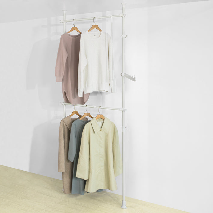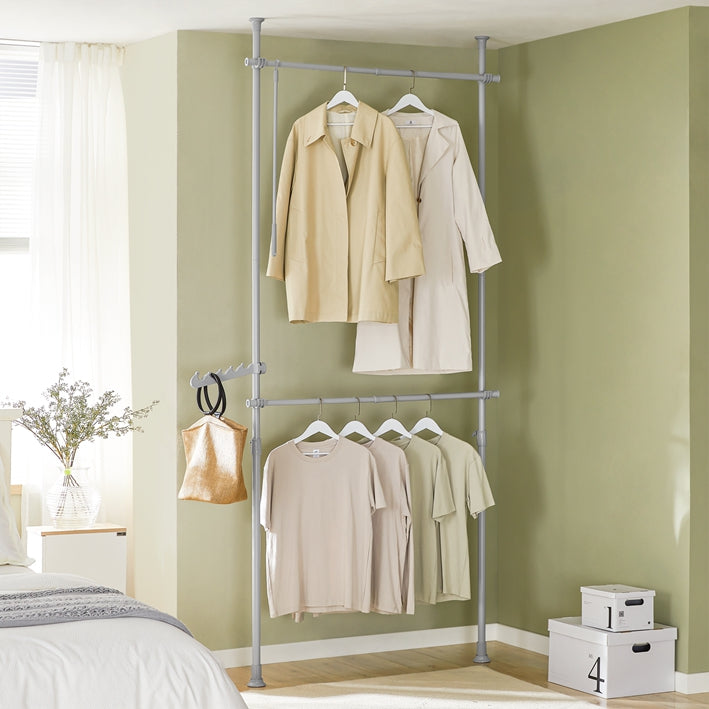 Eenvoudige installatieVergeet ingewikkelde montage-instructies! Deze telescopische kledingroede is ontworpen voor eenvoudige installatie. Klem de stangen eenvoudig tussen de vloer en het plafond en je bent klaar om je kleding te ordenen.