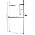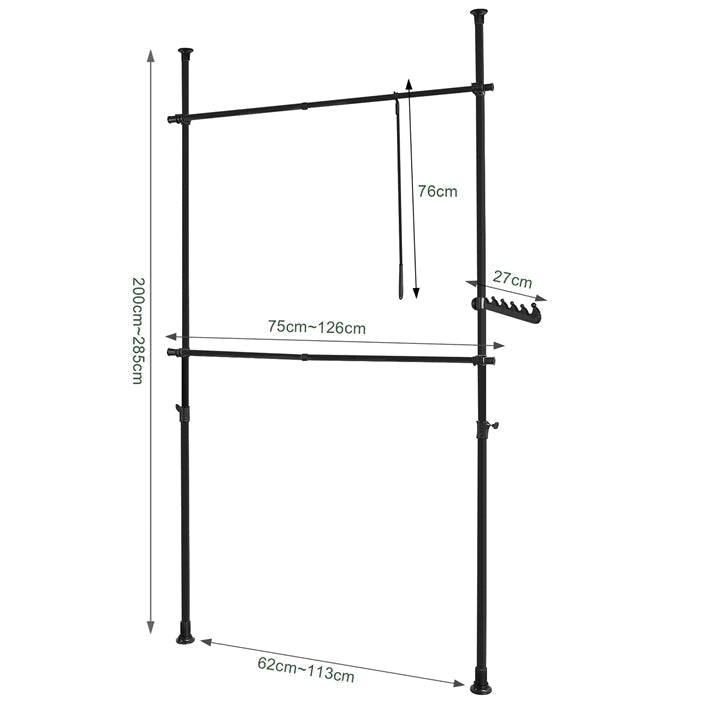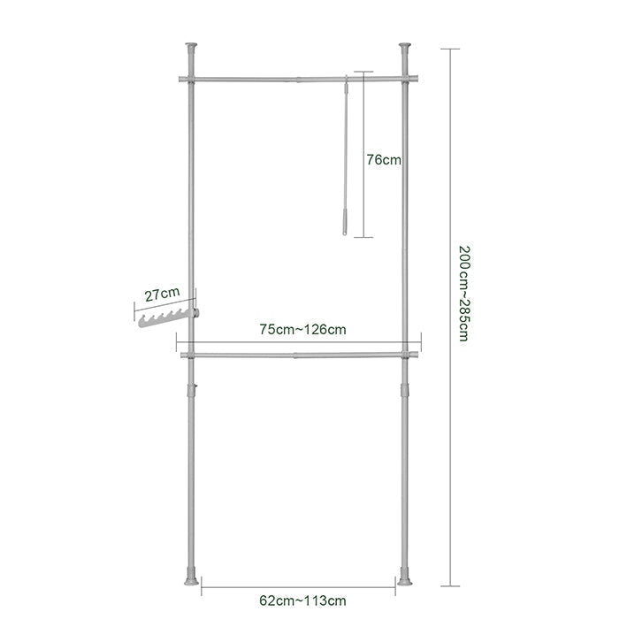 Verstelbare afmetingenMet zijn innovatieve verstelbare kenmerken kan dit kledingroede worden aangepast aan uw specifieke behoeften. Hij is zowel in de breedte als in de hoogte uitschuifbaar, waardoor hij ideaal is voor verschillende ruimtes en ervoor zorgt dat al je kledingstukken perfect passen.