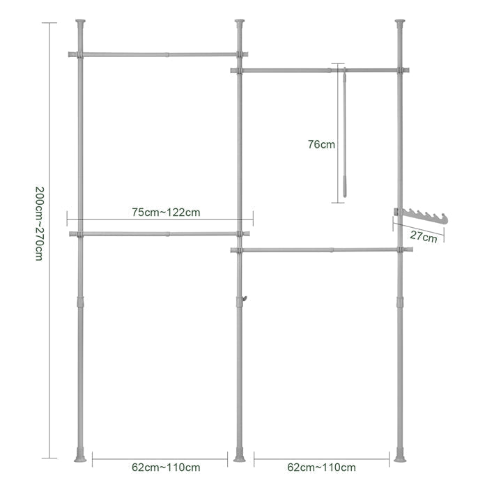 Verstelbare afmetingenDankzij het innovatieve verstelbare ontwerp kan deze kledingroede worden uitgebreid van 124 cm tot 226 cm breed en van 200 cm tot 285 cm hoog, waardoor hij perfect in verschillende ruimtes past.