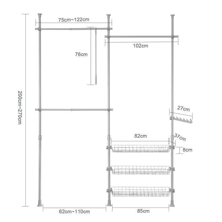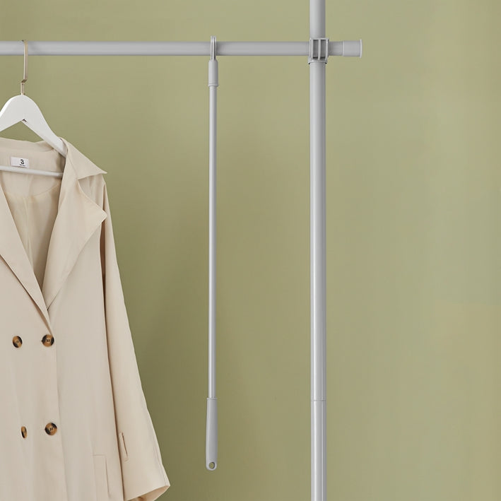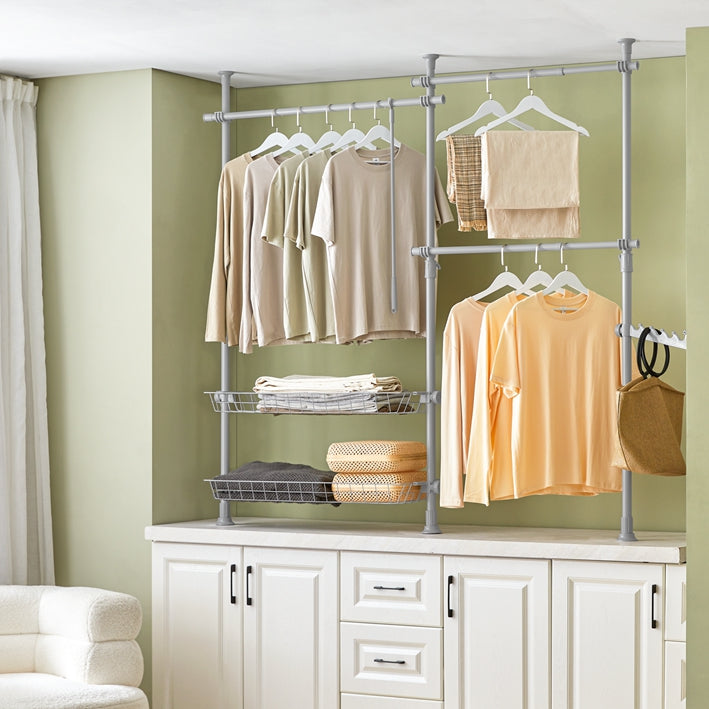 Duurzame constructieDeze garderobe-organizer is gemaakt van robuuste stalen staven en stevige plastic verbindingsstukken en is gebouwd om lang mee te gaan, zodat je kleding veilig en georganiseerd blijft.