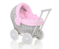 Vlechtwagen Poppenwagen Grijs met Roze Beddengoed en Zachte Padding