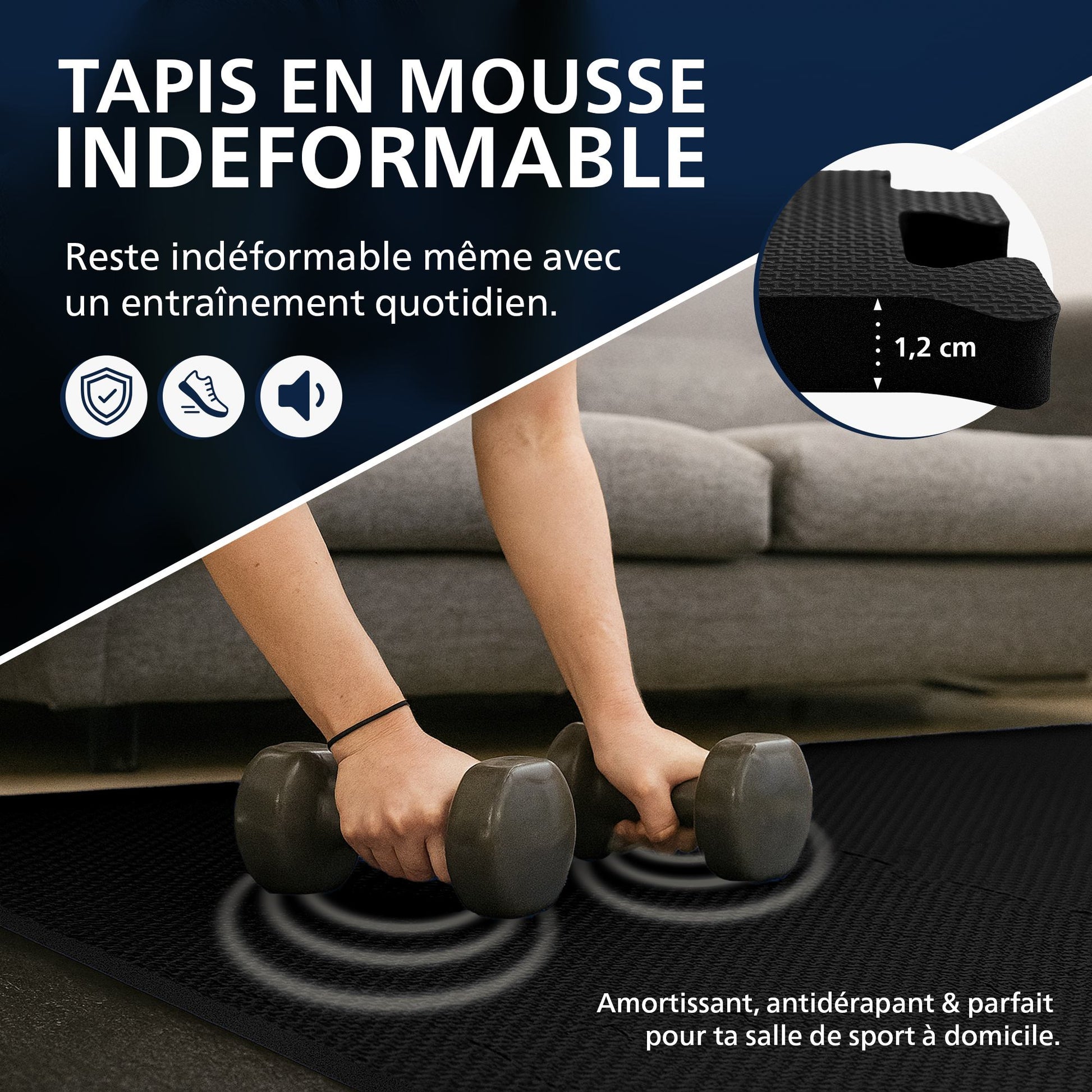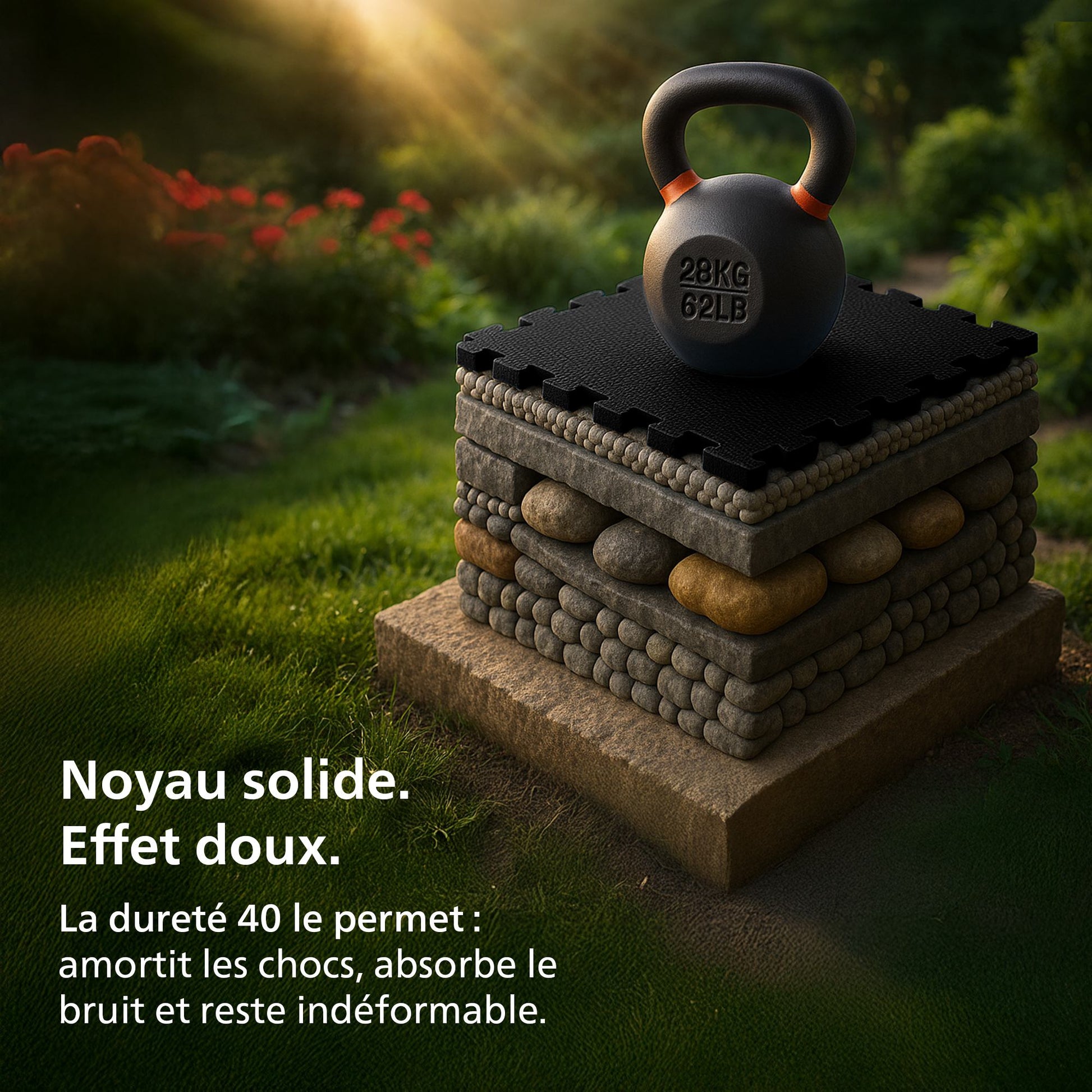 Gemaakt van hoogwaardige low-density schuim met een dikte van 1,2 cm (hardheidsgraad 40), absorberen ze effectief schokken en verminderen ze lawaai en trillingen. Het gestructureerde oppervlak biedt antislip grip, ook bij vochtigheid, en zorgt voor veiligheid tijdens sportactiviteiten of als ondergrond voor machines.