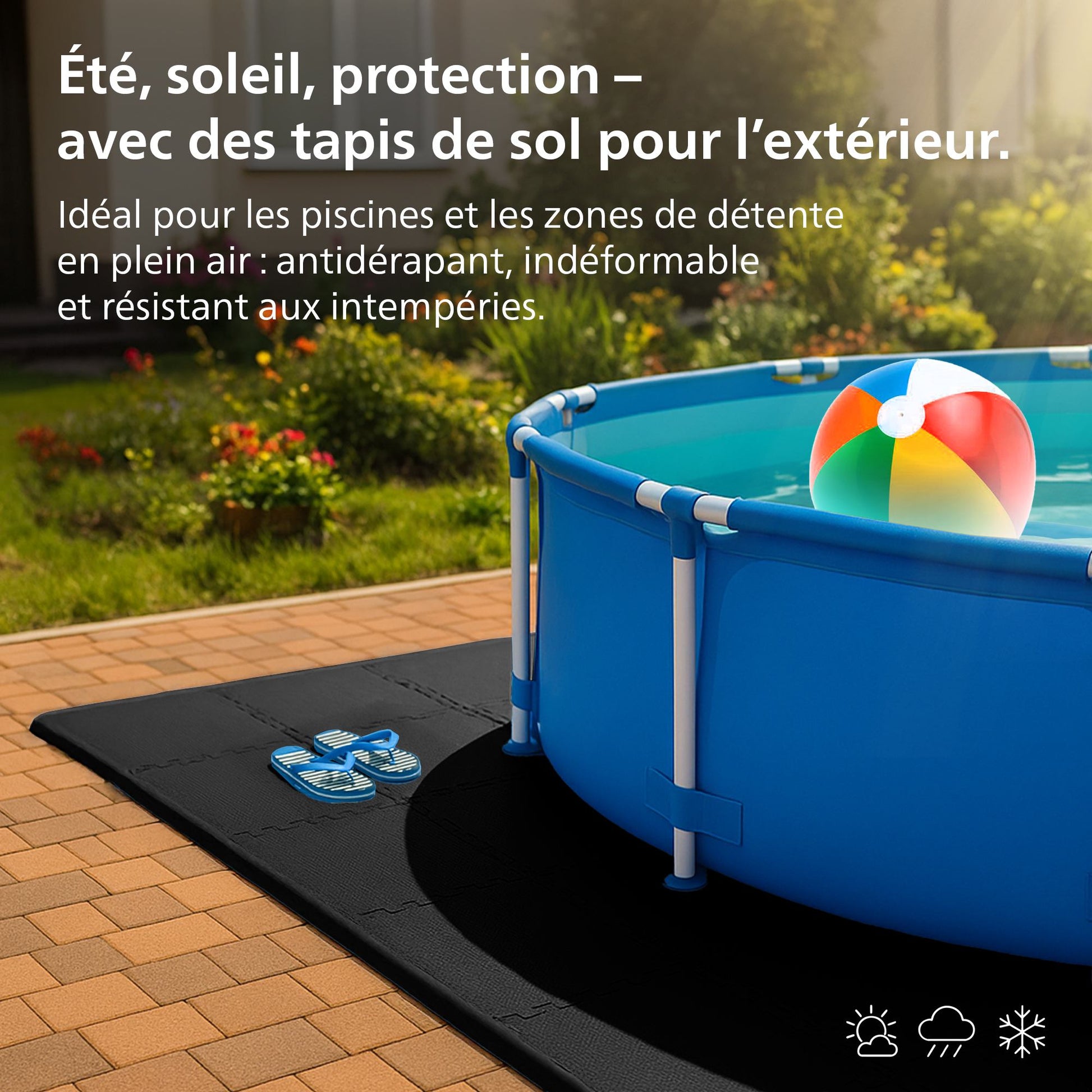 Dankzij het innovatieve T-puzzelontwerp kunnen de matten eenvoudig modulair uitgebreid worden en aangepast worden aan elke ruimte. Afhankelijk van de keuze zijn er 18, 24 of 36 matelementen bijgevoegd, inclusief randelementen voor een nette en professionele afwerking. De water- en vochtbestendige materiaalsamenstelling maakt schoonmaken makkelijk – een vochtige doek volstaat om vuil en vocht te verwijderen.