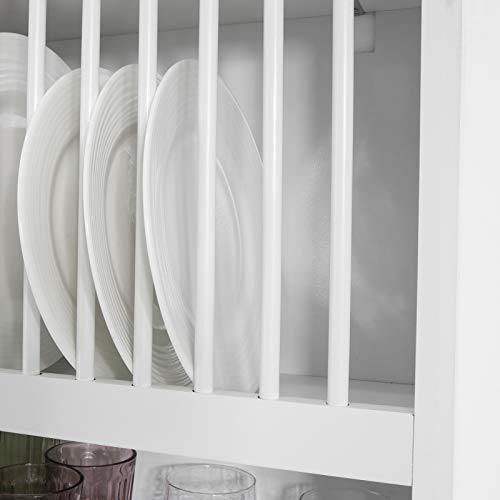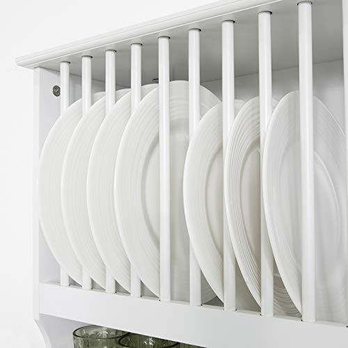 Details: Dit veelzijdige en praktische keukenrek is een goede aanvulling op je keuken. Een eenvoudige en stijlvolle manier om de keukenruimte te maximaliseren. Het houdt borden en mokken uit de weg en wordt op een aantrekkelijke manier tentoongesteld. Het beschikt over een opbergplank aan de bovenkant, ruimte voor 12 borden in het midden en een opberggedeelte eronder voor mokken, kopjes, enz. Geschikt voor borden met een maximale diameter van 29 cm. Ruimtebesparende opbergoplossing die ervoor zorgt dat uw keuken netjes en georganiseerd blijft. Productdetails Materiaal: MDF, grenenhout. Kleur: Wit. Afmetingen: B55 x D24 x H51cm. Gewicht: 7kg. Draagvermogen: 10 kg. Het artikel wordt geleverd in een platte verpakking en vereist zelfmontage. Gedetailleerde instructies meegeleverd. De decoratieve elementen zijn niet bij de levering inbegrepen. Als u vragen heeft, neem dan per e-mail contact met ons op, wij zullen zo snel mogelijk antwoorden!