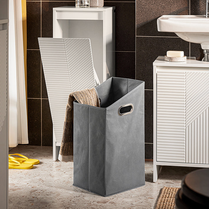 De Wasmand met een schuin oppervlak en twee uitsparingen is ontworpen om het opnemen en organiseren van uw wasgoed efficiënt te vergemakkelijken. De kist is gemaakt van hoogwaardig MDF (E1) materiaal met precieze afmetingen van ongeveer 30x87x30cm.