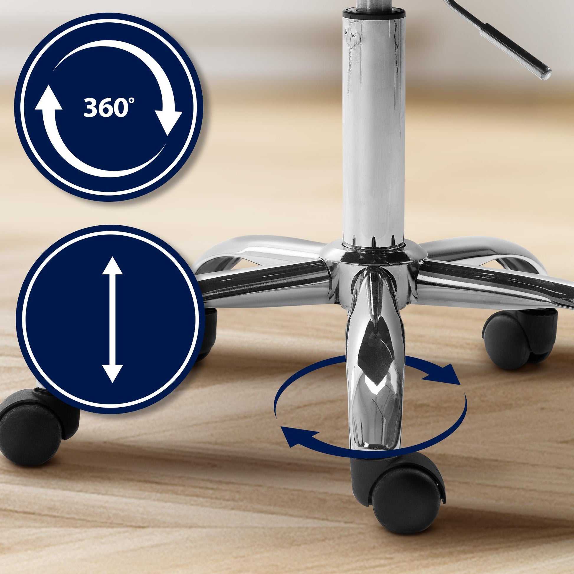 De comfortabele rugleuning biedt ondersteuning aan de onderrug, zodat je langdurig en comfortabel kunt werken. Het stevige metalen frame, uitgerust met soepel draaiende wielen, garandeert stabiliteit en bewegingsvrijheid.