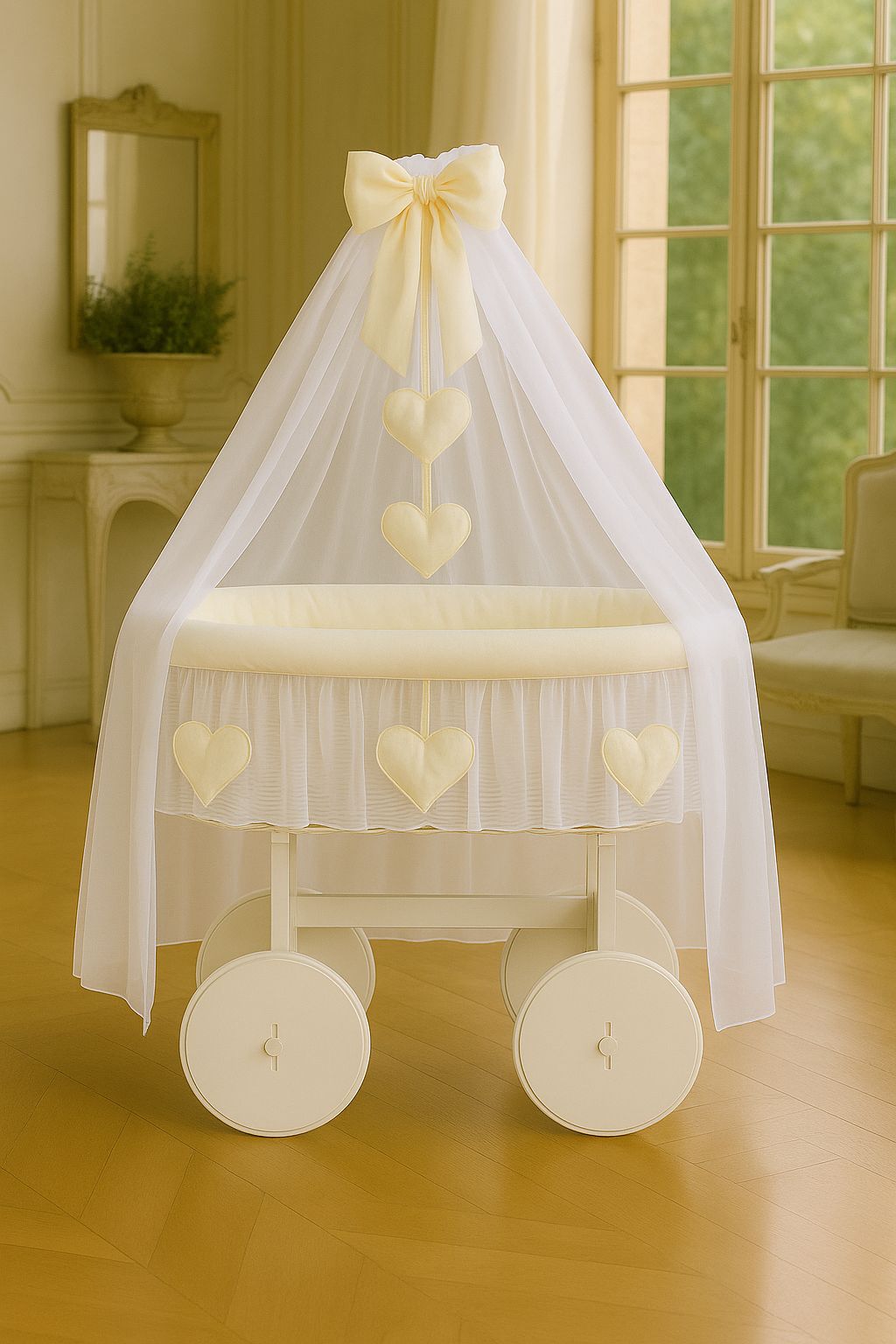 Een unieke, handgeweven wicker wieg op een stabiele houten basis — ideaal voor pasgeboren baby's tot 6-9 maanden oud. Dit hoogwaardige product is volledig gemaakt in de EU, van natuurlijke en milieuvriendelijke materialen zoals wicker en hout. Dankzij het lichte maar stevige ontwerp is de wieg gemakkelijk te verplaatsen, waardoor je jouw kleintje dicht bij je kunt houden voor rust en geborgenheid.