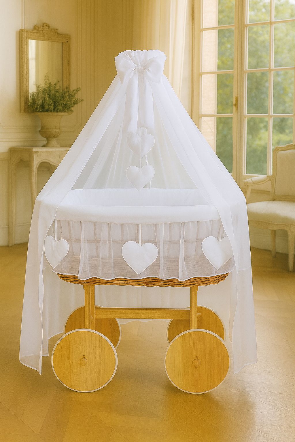 Wicker Mand met Baldakijn Deluxe Amelie – Natuurlijk + Witte Beddengoed | BellaFurn Baby