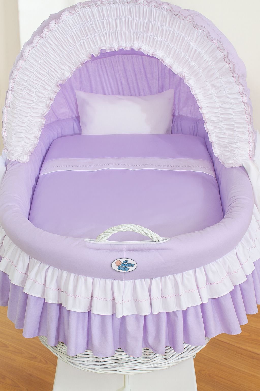 Wicker mand wiegje - babymand - eco & handgemaakt, met lila beddengoed en houten onderstel