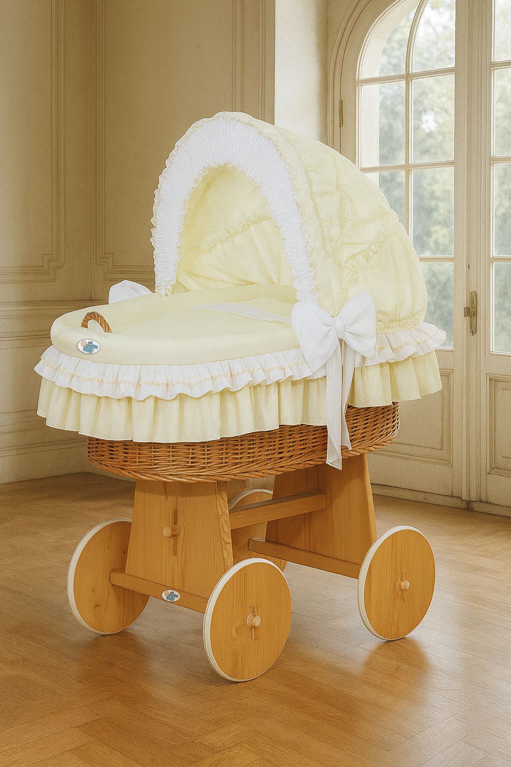 Een uniek en premium product voor uw baby: een handgeweven wicker mandje op een stevige houten onderbouw. Perfect voor pasgeboren of baby's tot 6-9 maanden. Gemaakt van natuurlijke, milieuvriendelijke materialen met aandacht voor detail. Lichtgewicht en toch robuust, makkelijk te verplaatsen voor een gevoel van nabijheid en rust voor uw kleintje.
