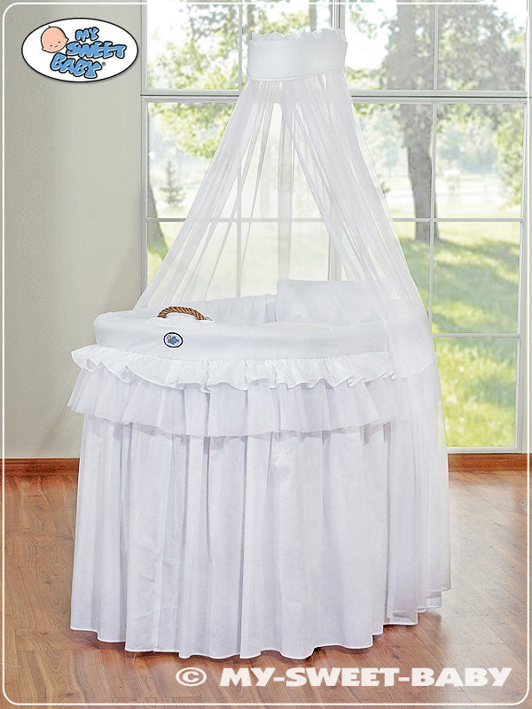 Deze prachtige mand is het grootste wiegje op de markt, gemaakt van natuurlijke materialen in heldere witte tinten. Het uitgebreide set bevat volledig beddengoed en een muskietennet, zoals afgebeeld op de foto.