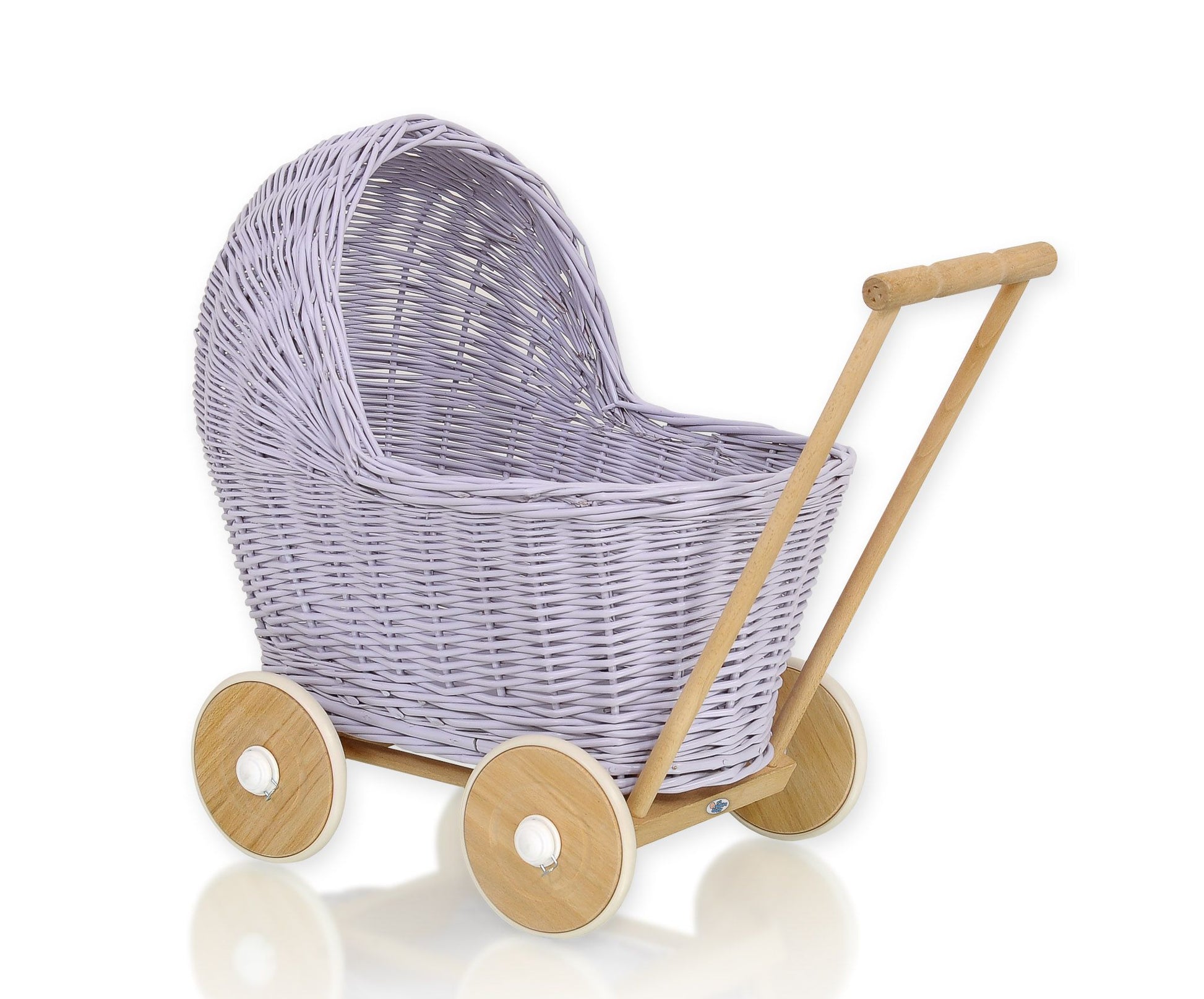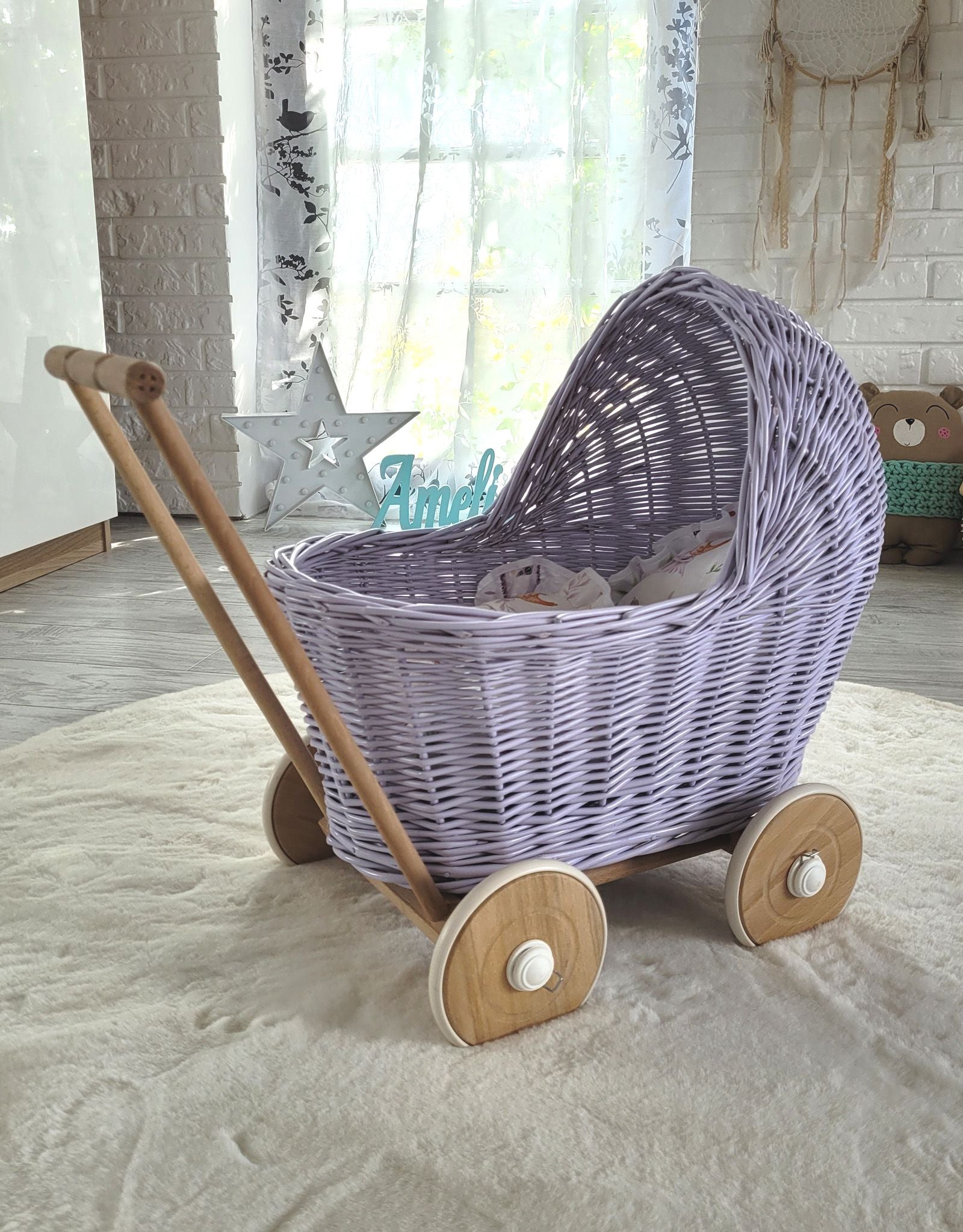 Wicker poppenwagen - poppenbuggy - handgemaakt wilgenteen, stabiel houten chassis, paars