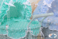 Wicker poppenwagen met mintkleurig beddengoed en voering – wit