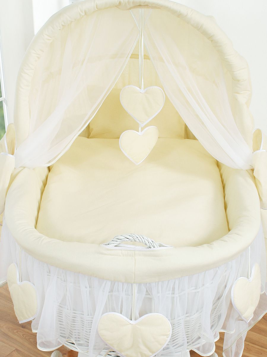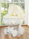 Wicker wieg Amelie met kap bovenkleed - wit + creme beddengoed