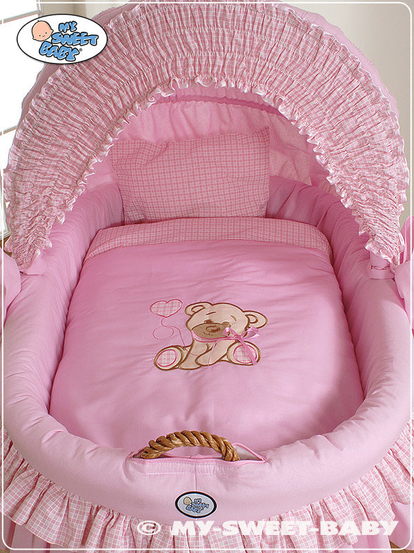 Een prachtige ruime mand met capuchon, inclusief schattige teddybeer met strikje in roze. Dit is de grootste wieg op de markt, gemaakt van natuurlijk wicker en hout voor een elegante uitstraling.