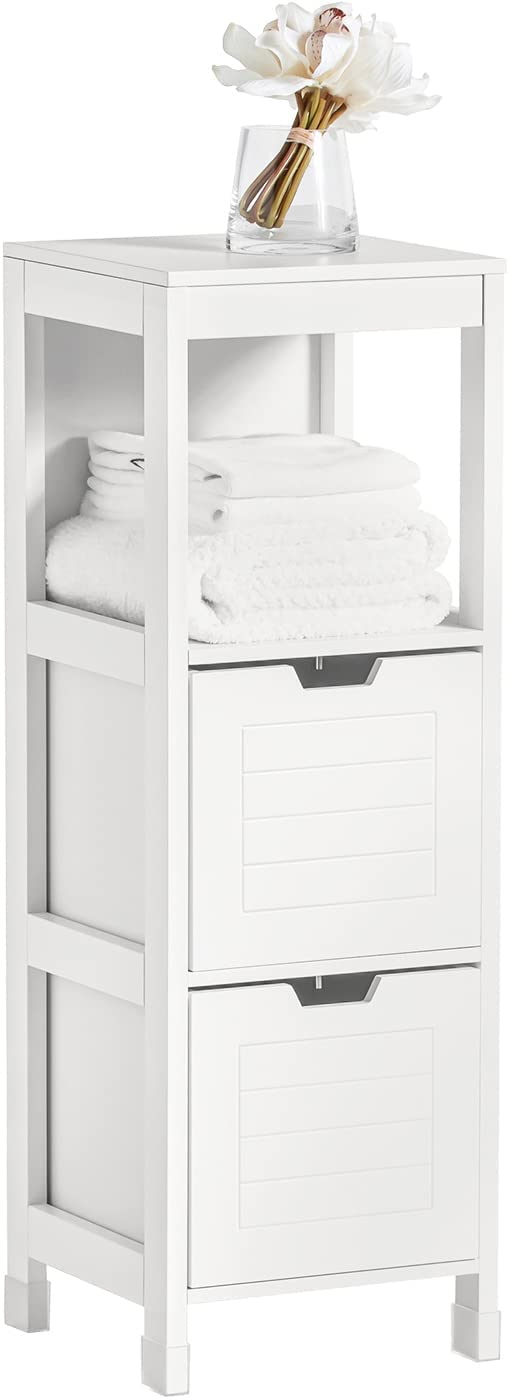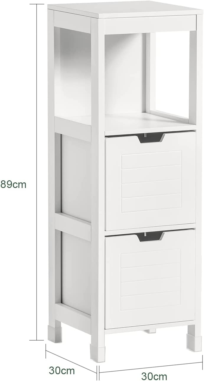 Details: Witte vloerstaande badkameropbergkast past perfect bij uw moderne of traditionele inrichting. De kast heeft 1 plank en 2 lades, zodat je voldoende opbergruimte hebt voor al je badkamerbenodigdheden. Ruimtebesparende opbergoplossing die ervoor zorgt dat uw badkamer netjes en georganiseerd blijft. Productdetails Materiaal/afwerking: MDF/wit. Afmetingen: B30 x D30 x H89cm. Gewicht: 12 kg. Laadvermogen: 10 kg/laag. Het artikel wordt geleverd in een platte verpakking en vereist zelfmontage. Gedetailleerde instructies meegeleverd. De decoratieve elementen zijn niet bij de levering inbegrepen. Als u vragen heeft, neem dan per e-mail contact met ons op, wij zullen zo snel mogelijk antwoorden!