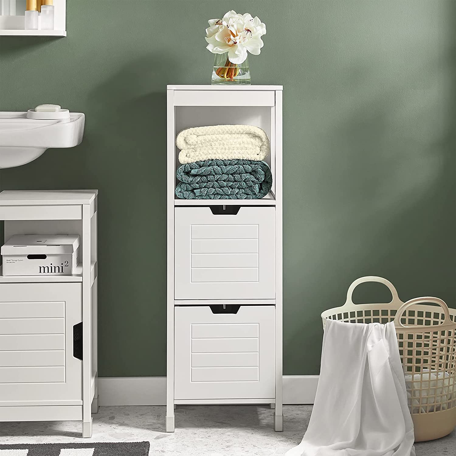 Witte vloerstaande badkameropbergkast met 1 plank en 2 lades