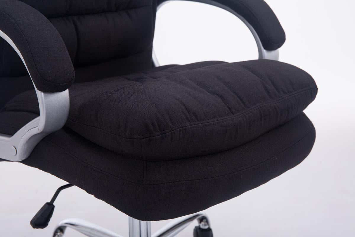 De stoel is exclusief met een hoogwaardige stoffen bekleding. De bekleding, versierd met stijlvolle stiksels, oogt niet alleen elegant, maar is ook robuust en onderhoudsvriendelijk. Het metalen onderstel, afgewerkt in een chromen look, zorgt voor stabiliteit.