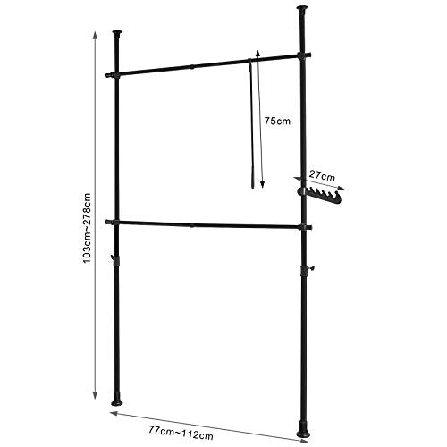 Details: Telescopische kledingkastorganizer, ophangrail, kledingrek en opbergplanken zijn zeer voordelig. Dit rekkensysteem biedt veel opbergruimte voor kleding en andere accessoires. Door het telescoopsysteem bespaart deze plank ruimte in elke kamer. Kenmerken Telescopisch systeem. Variabele maat. Stabiel en eenvoudig ontwerp. Weinig ruimte in beslag. Veel opbergruimte. Snelle en eenvoudige installatie. Productdetails Materiaal: metalen buizen met plastic connectoren. Afmetingen: B(77-112) x H(103-278)cm. Gewicht: 4,2 kg. Laadvermogen: 40kg. Alle montagehardware is inbegrepen voor eenvoudige zelfmontage. De decoratieve elementen zijn niet bij de levering inbegrepen. Als u vragen heeft, neem dan per e-mail contact met ons op, wij zullen zo snel mogelijk antwoorden!