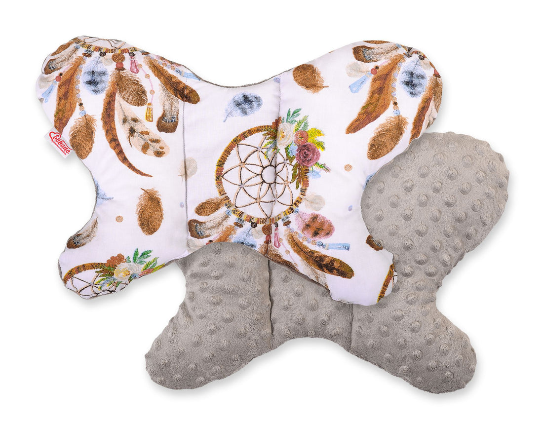 Dubbelsidig stötdämpande kudde "BUTTERFLY" - Vit med drömfångare Denna multifunktionella dubbelsidiga stötdämpande kudde "BUTTERFLY" är...