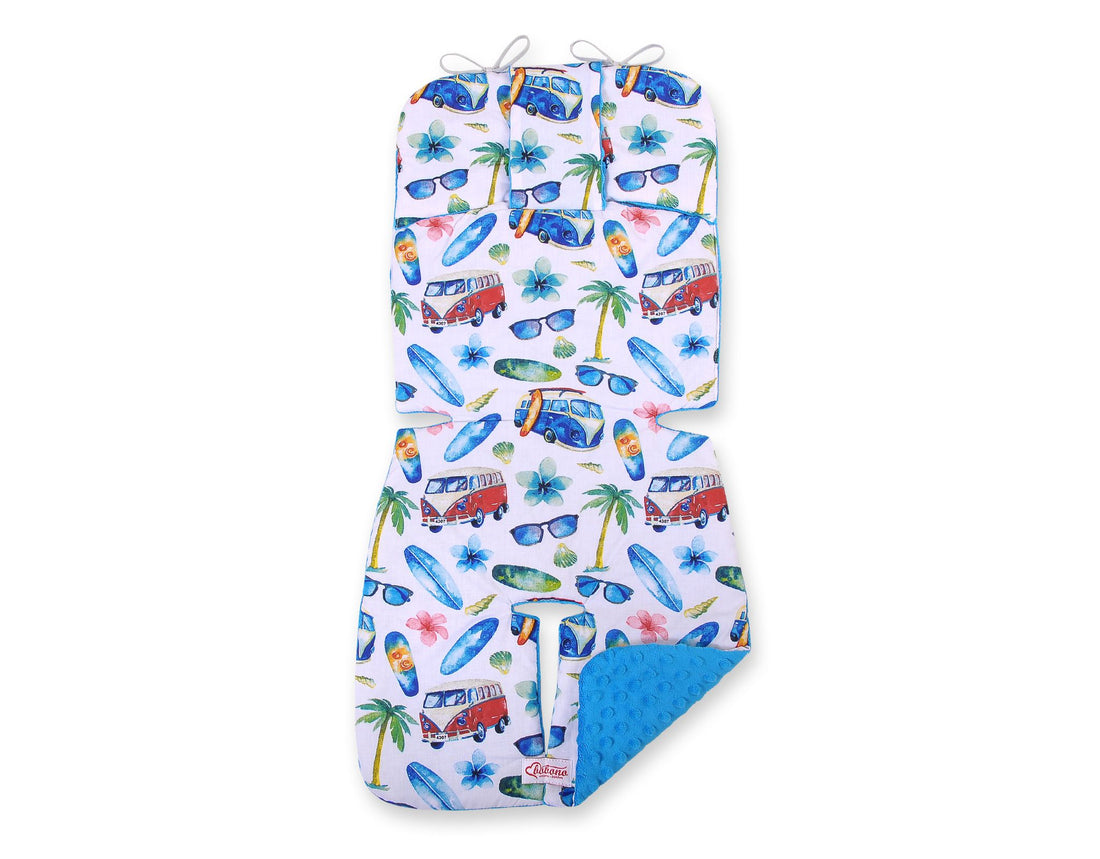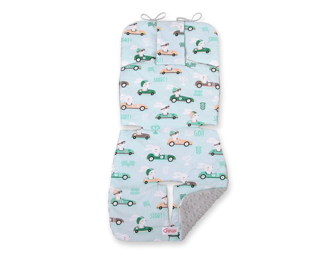 Dubbelsidig vagninsats BOBONO - buss/turkos Ett extremt mjukt och bekvämt barnvagnsinlägg, tillverkat av 100 %...
