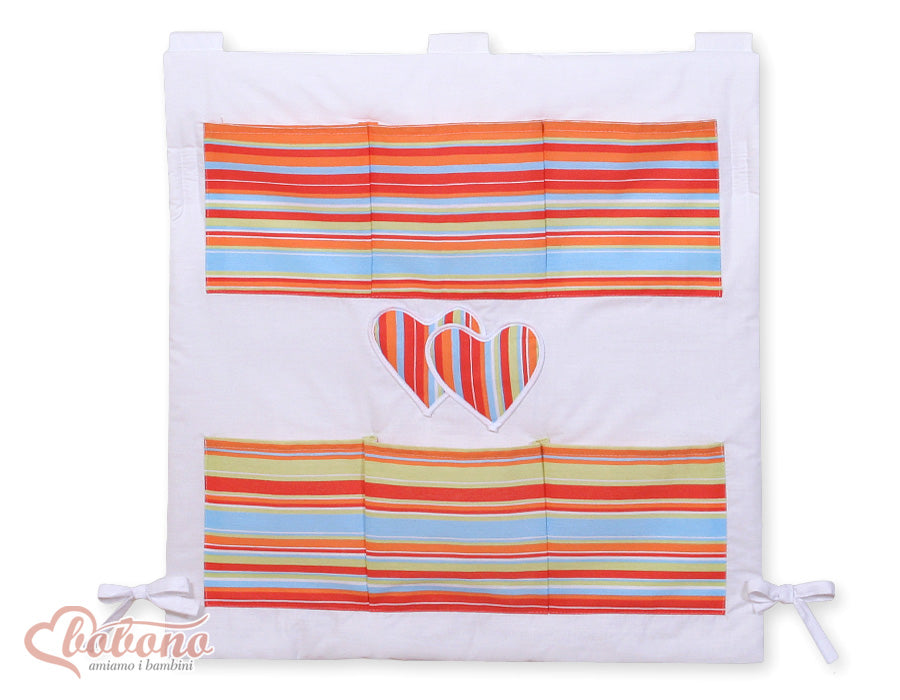 Hängande hjärtformad spjälsängsorganisatör Praktisk spjälsängsorganisatör med färgglada orangea remsor, perfekt för förvaring av leksaker, blöjor,...