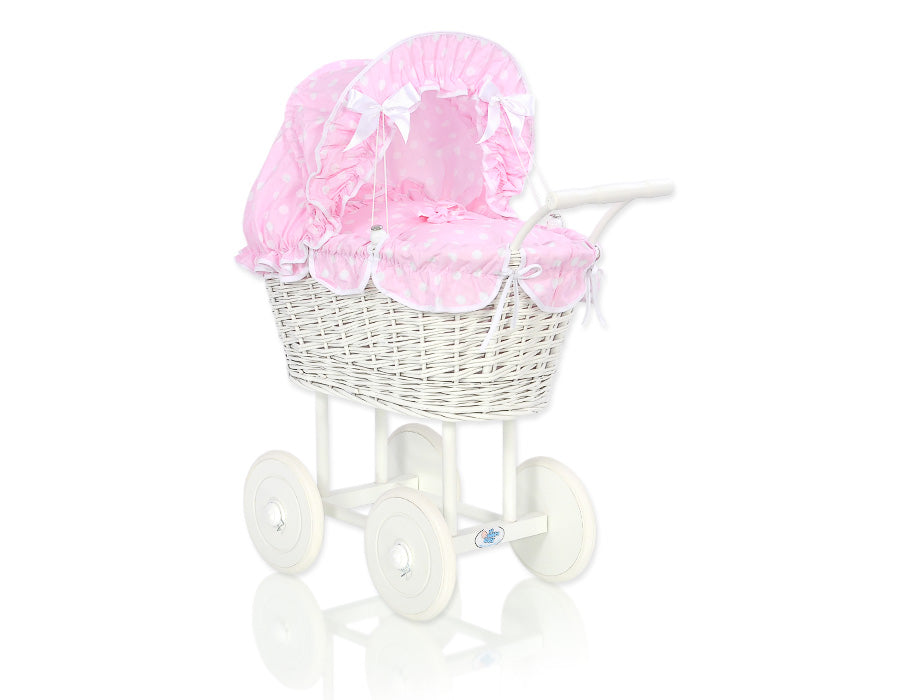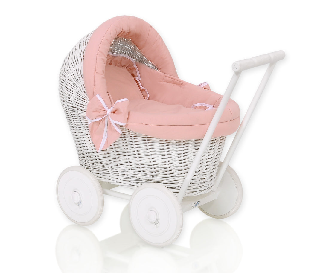 Dockvagn i rotting - leksaksvagn - handgjord och ekologisk, rosa klädsel, robust trä