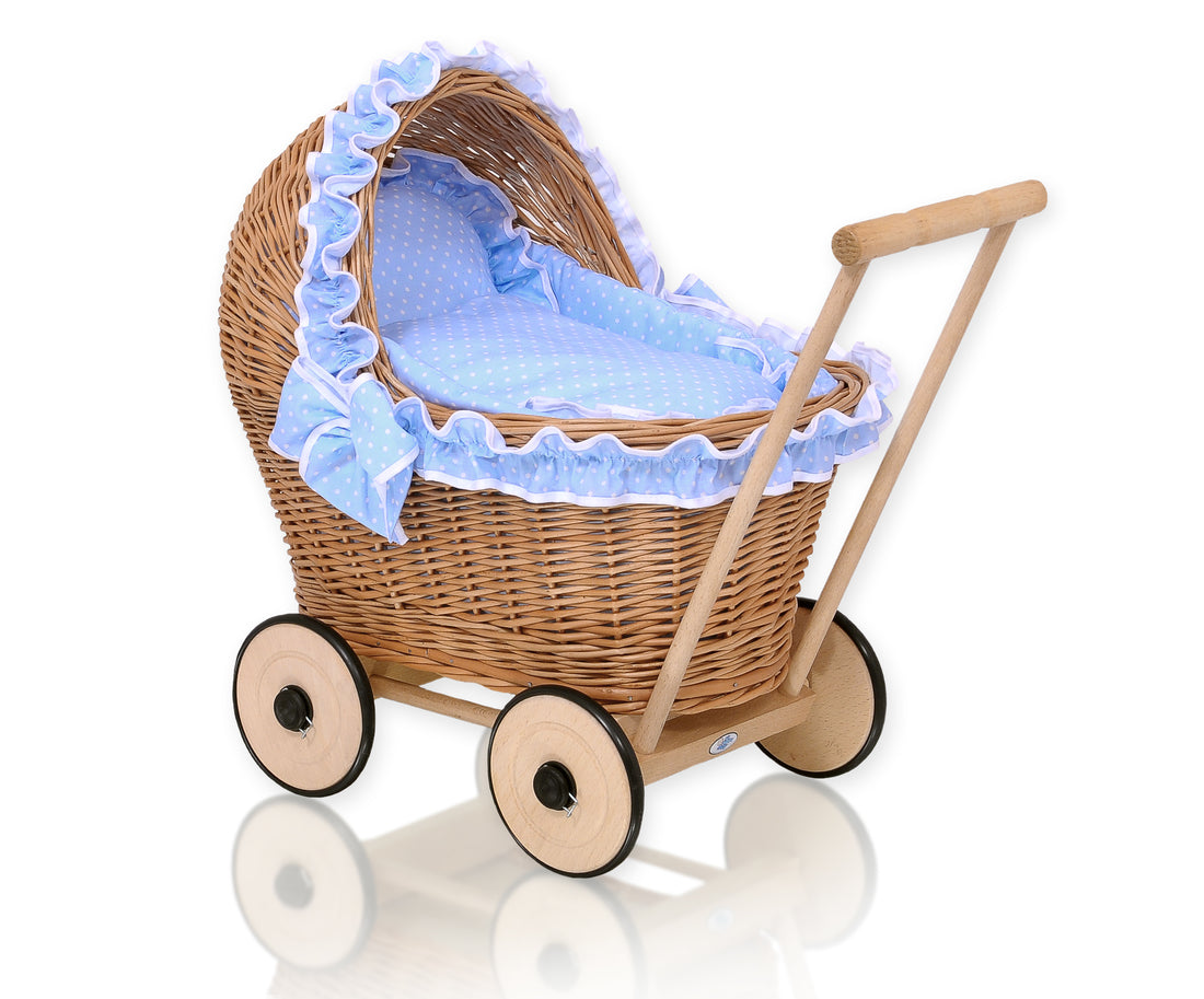 Dockvagn, rottingvagn, handgjord och ekologisk – med mjuk blå klädsel