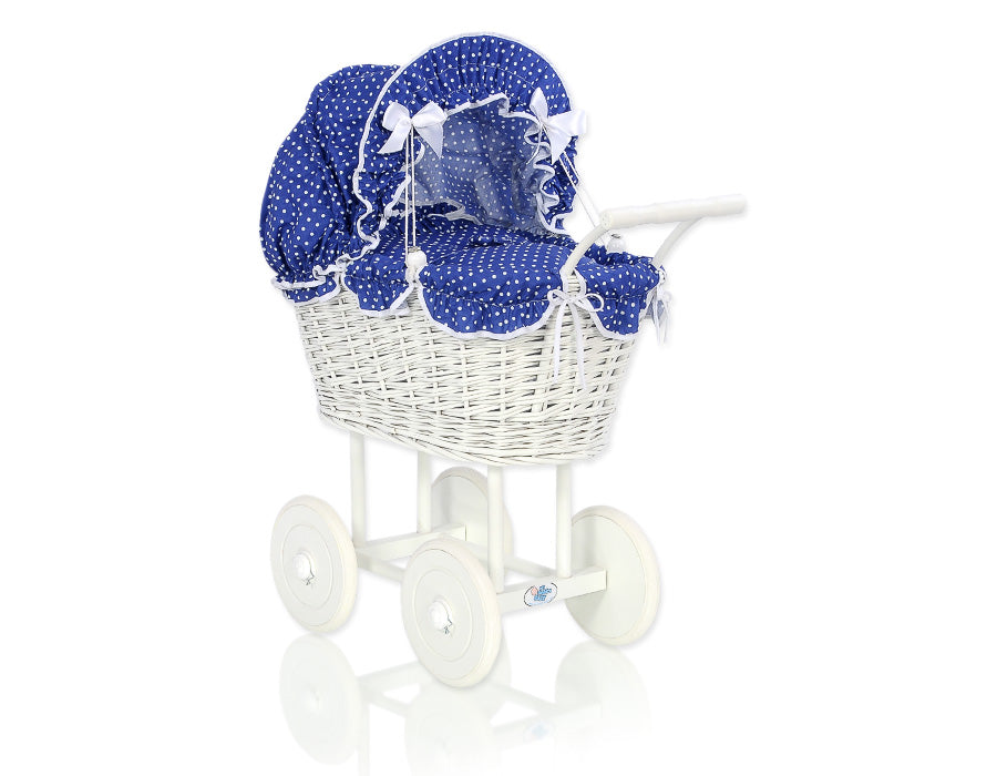 Dockvagn, rottingvagn, handgjord och säker – med marinblå klädsel