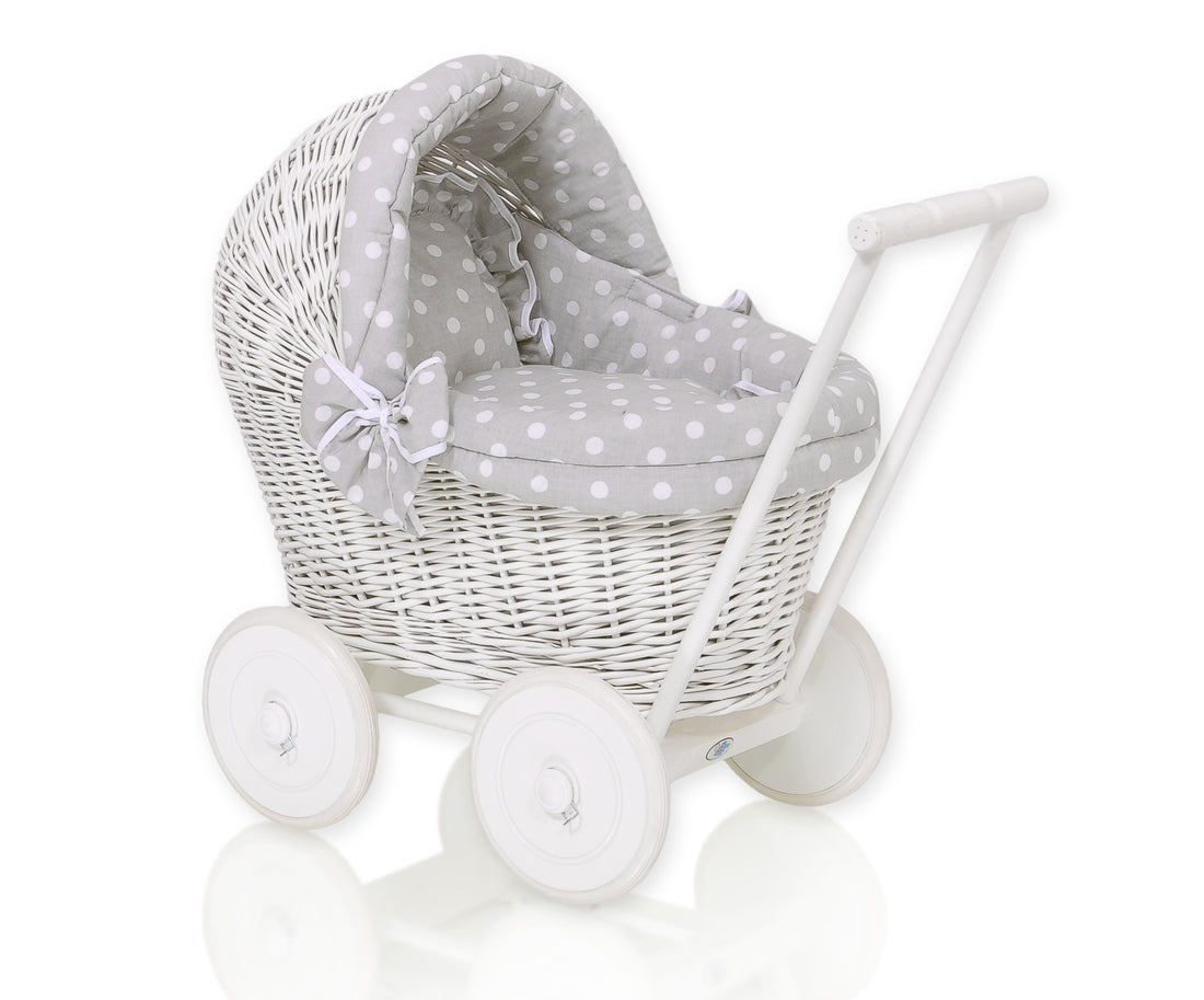 Vit dockvagn tillverkad av naturlig rotting med grå klädsel och mjuk vaddering Denna charmiga dockvagn...