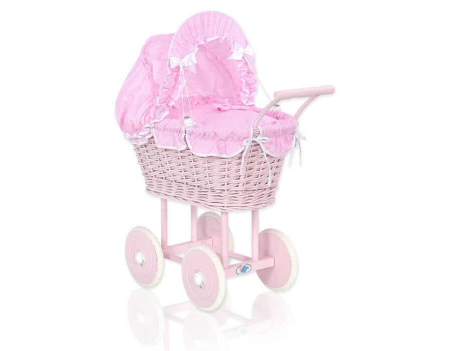 Rosa dockvagn - handgjord rottingvagn - ekologiskt och bekvämt klädd