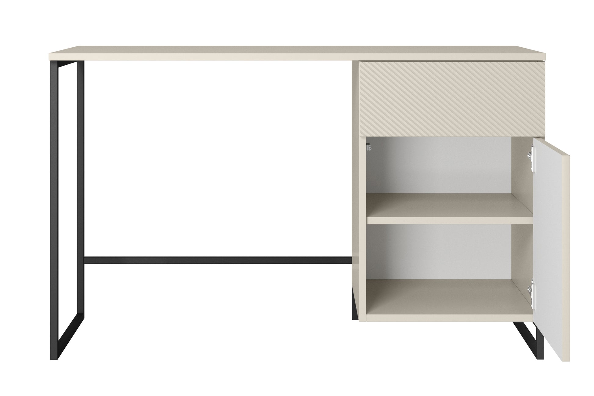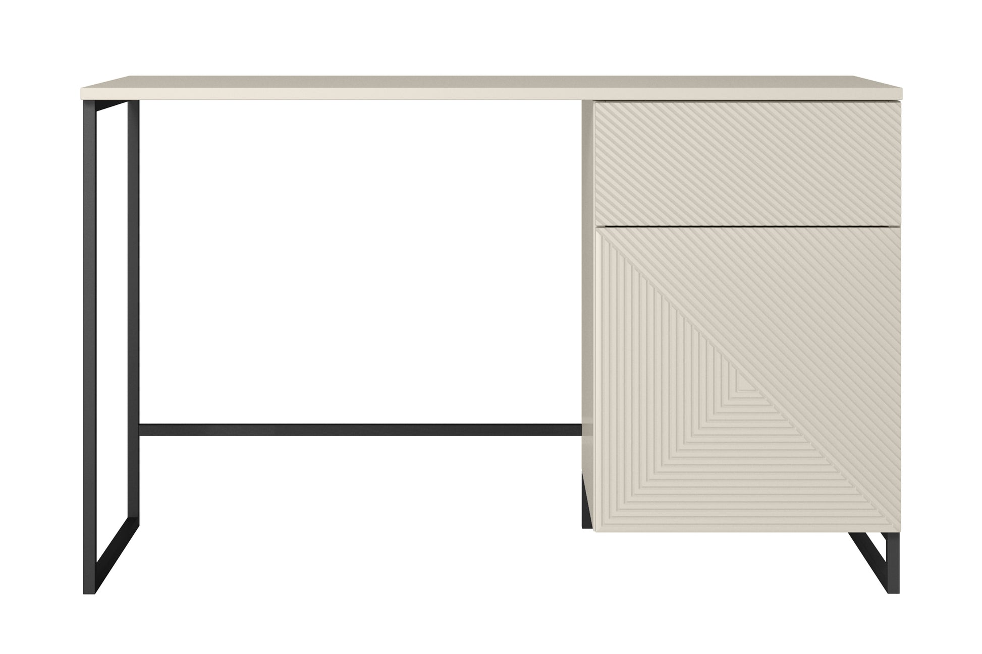 Het Asha bureau 120 cm combineert modern design met praktische functionaliteit. De stijlvolle afwerking in kasjmier en het stevige zwarte frame brengen een eigentijdse look in iedere werkruimte. De matte afwerking en het elegante gegroefde front maken dit bureau uniek, terwijl het duurzame gelamineerde karton en MDF zorgen voor uitstekende krasbestendigheid. Dankzij de ruime lade met kogelgeleiders en het push-to-open-systeem opent u de lade eenvoudig en geruisloos. Dit bureau is perfect voor een minimalistische, loft- of Scandinavische inrichting en brengt sfeer en stijl in uw kantoor of thuiskantoor.