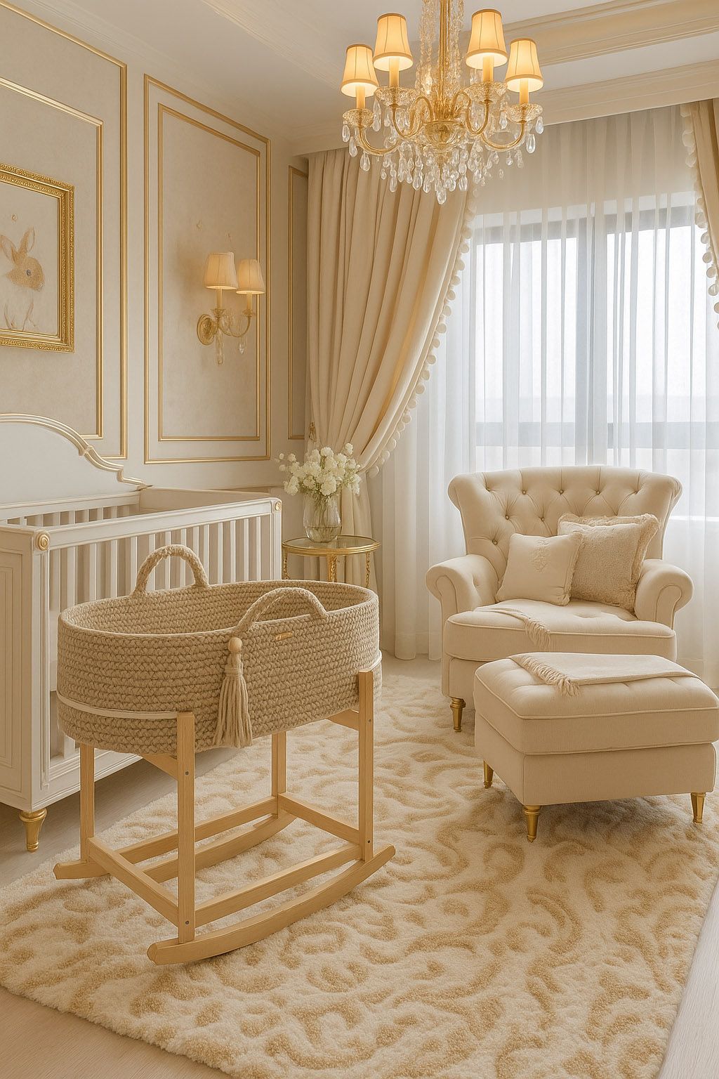 BOHO handgjord babykorg - spjälsäng - med antibakteriell madrass och gungstol i trä, säker och mysig