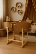 Setet innehåller ett handgjort vaggställ i bokträ som matchar korgen perfekt. Dess robusta men lätta konstruktion möjliggör mjuk vaggning, vilket stimulerar ditt barns neurologiska utveckling. Gungstället kan låsas för att stabilisera basen.