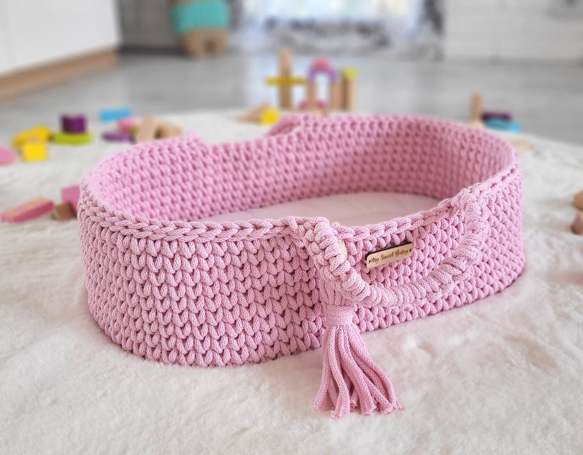 En vacker korg i snygg BOHO-design, specialdesignad som en miniatyr av vår BOHO babykorg. Perfekt lekstund för alla små flickor! Denna 100 % polska handgjorda produkt har en fin design som passar in i alla flickrum och är den perfekta födelsedagspresenten.